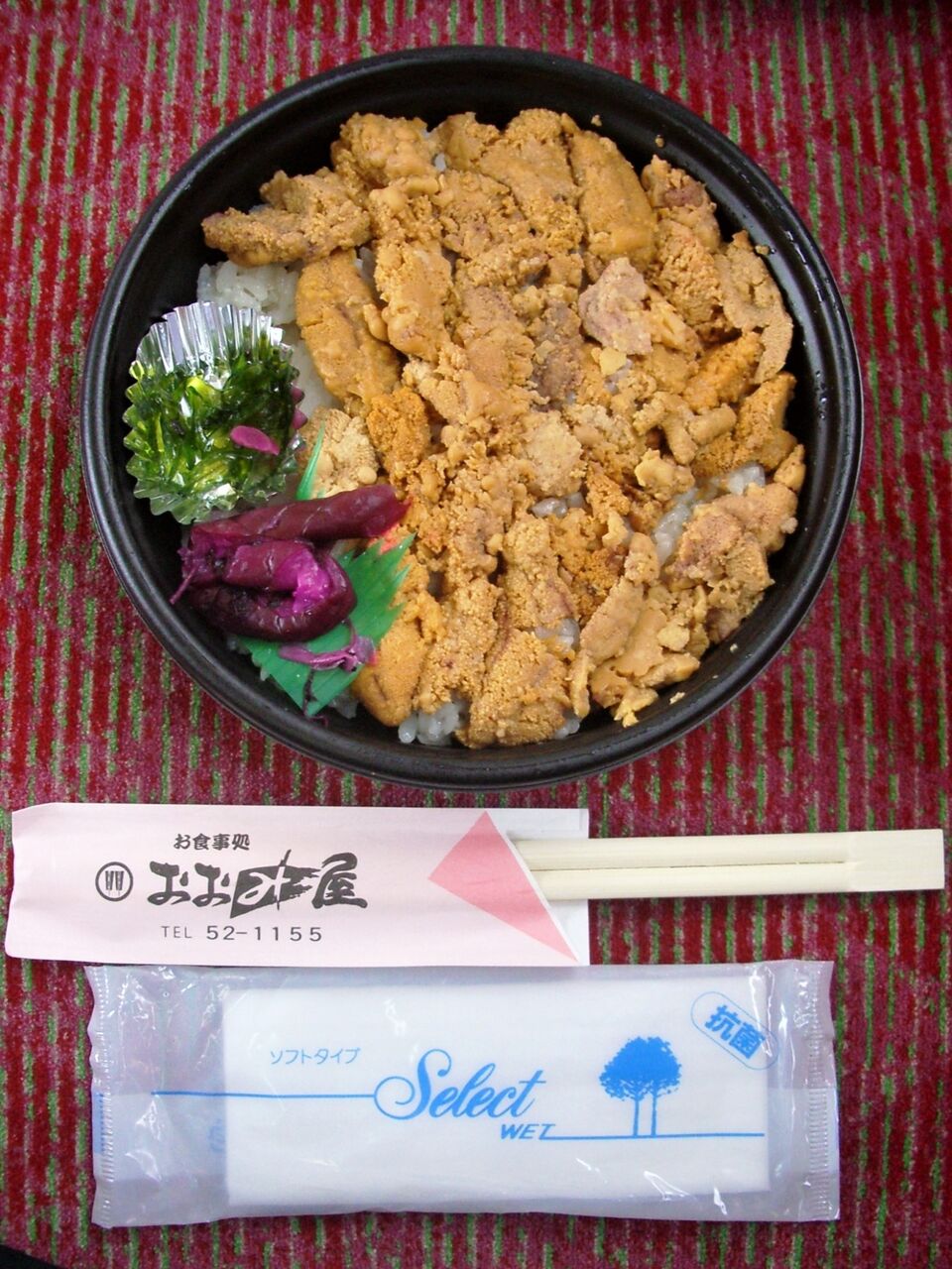 税込1,600円。ご飯の上にあわび、うに、蟹、いくらと錦糸卵がのったお弁当。掛紙表面(写真左)には『祝三陸鉄道全線開通』の文字入り。魚介類が4種類もあると楽しく、これも当然のことながら美味しい弁当でした。中身は2008年リアスシーライナー弁当・海鮮あわび弁当と同じようです。《うに丼》