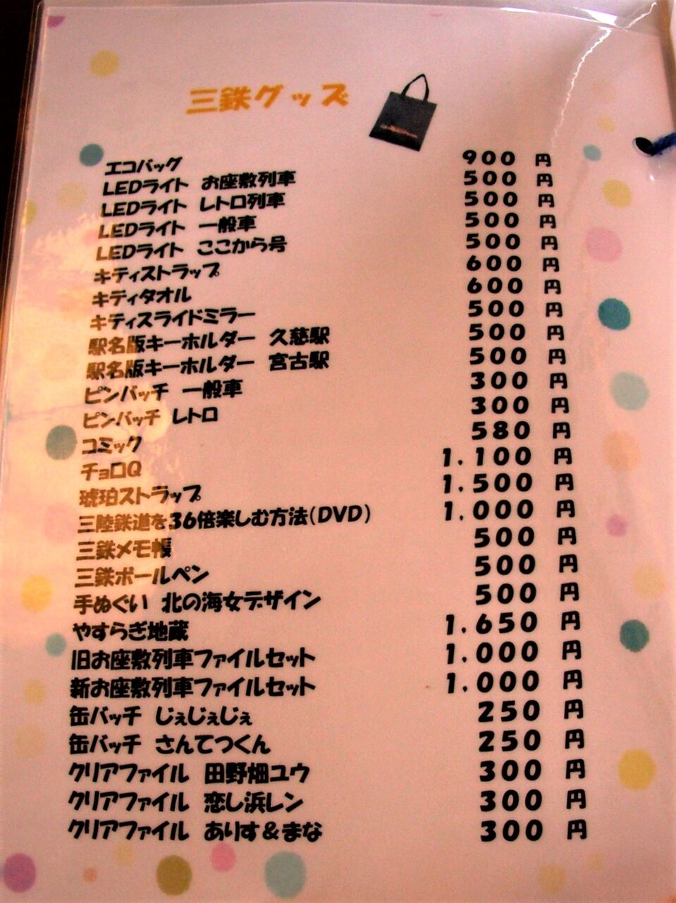 扱っているジャンルは食品(菓子、おつまみ)、お飲物、三鉄グッズと幅広く、特にグッズ類はかなりの品数となっていました。後述の予約制弁当と合わせれば観光列車として完璧な供食体制。