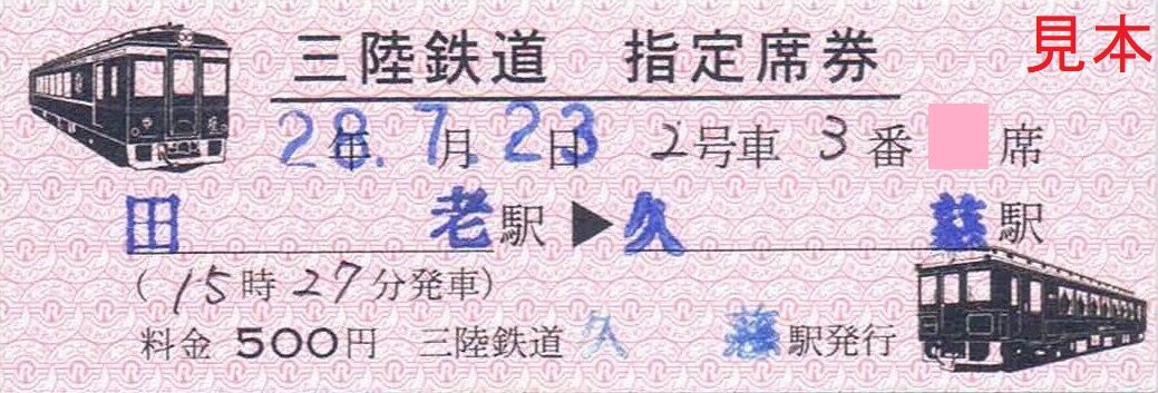 駅で発売されたお座敷列車北三陸号の指定席券で発行駅・乗車駅・下車駅は補充。列車名は入らず、乗車駅の時刻・号車・席番を記入。なお、同年の指定席料金は500円でしたが、2017年は310円、2018年は300円になっています。《115D車掌発行 車内指定席券(平成28年7月23日)》