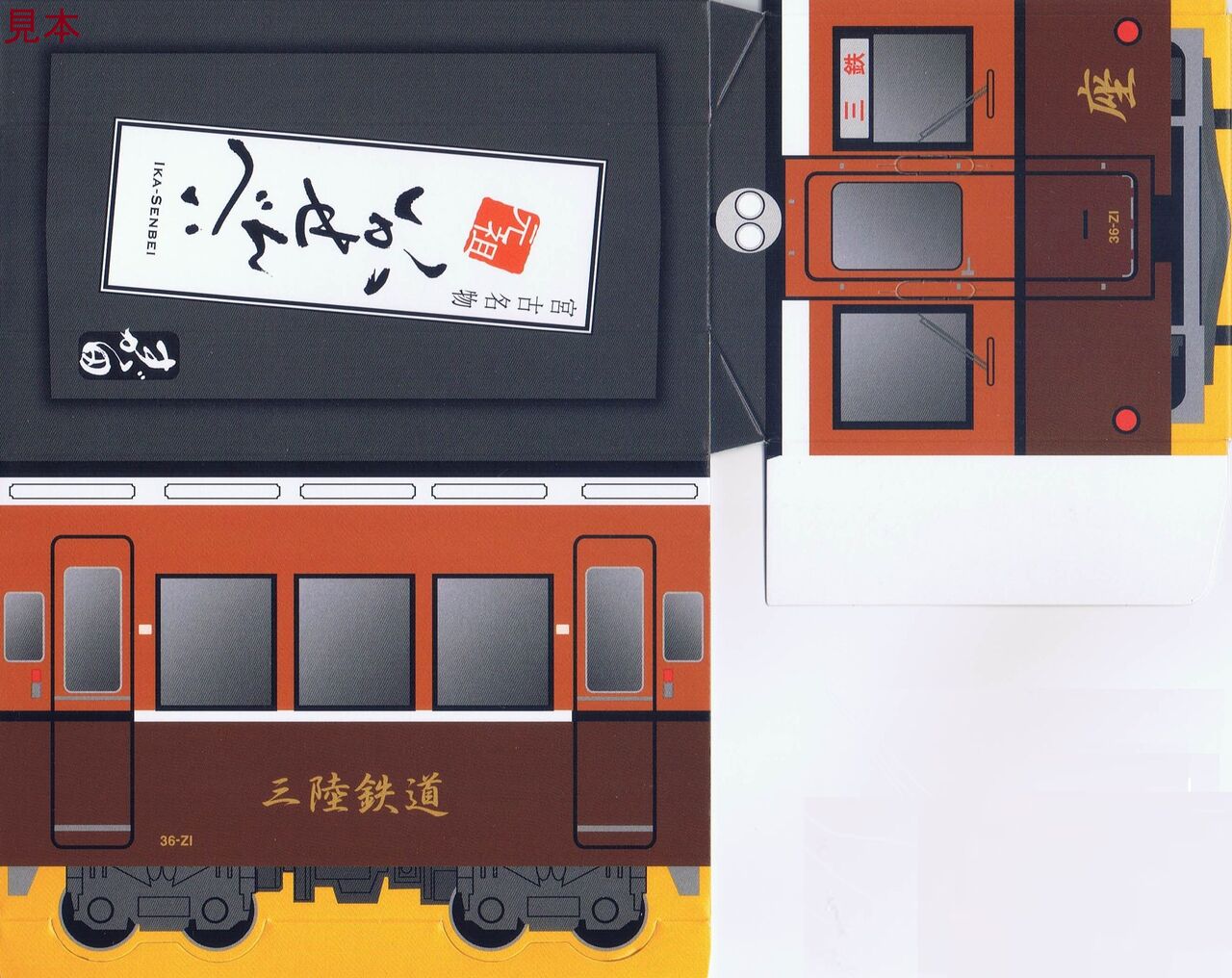製造者は宮古市川井の『みついし』。本列車で販売する三陸鉄道デザインの商品としては最安の200円。ゴマや青のりの入った甘くて美味しいせんべい。《元祖いかせんべい》