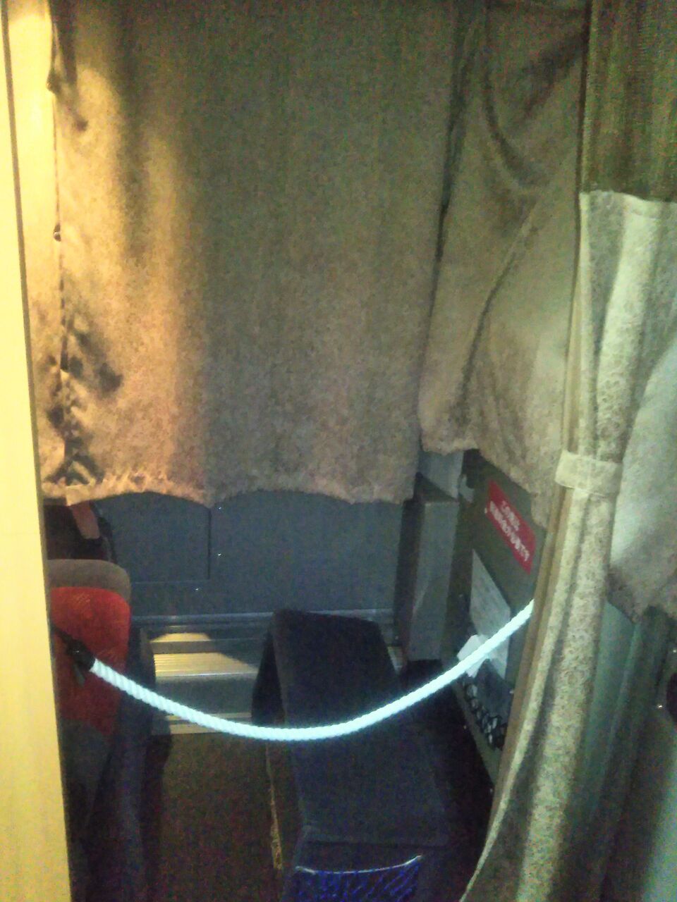 前後の仕切りはカーテン。しっかり固定はされています。運転席後ろの席を利用しましたが、前面からの景色は楽しめません。睡眠目的ならば利用価値は大きいです。