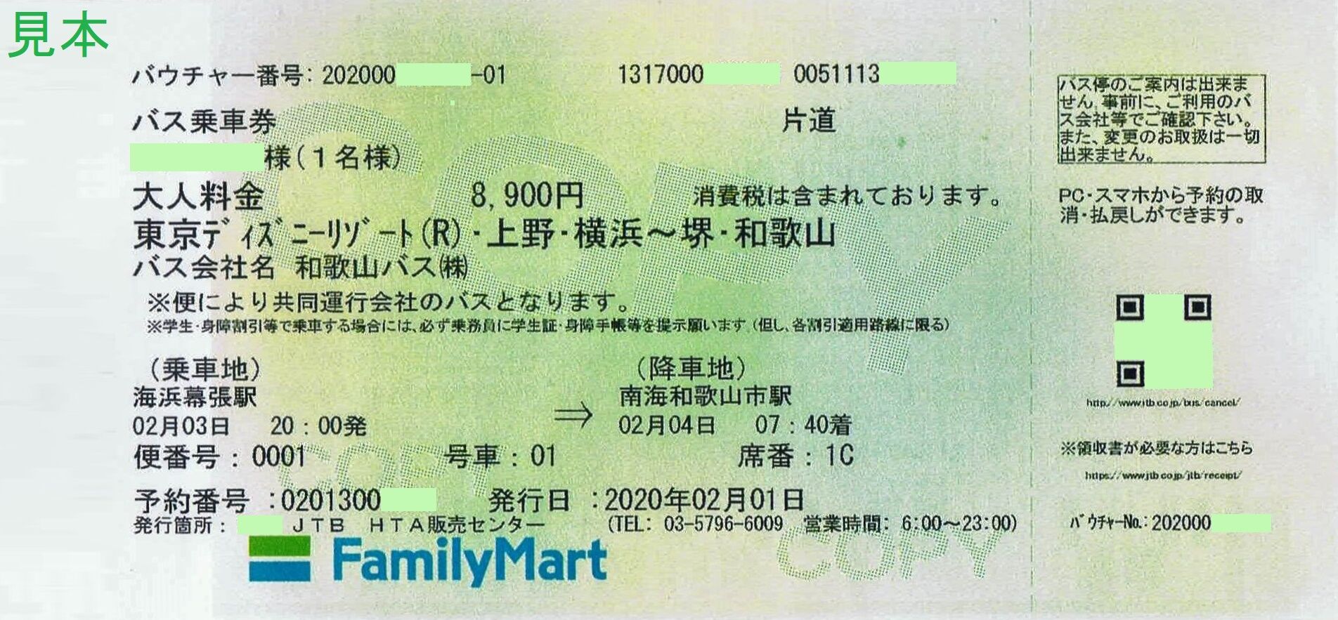 《ファミリーマート(JTB HTA販売センター)発行 サウスウェーブ号 バス乗車券(2020年2月4日乗車分)》