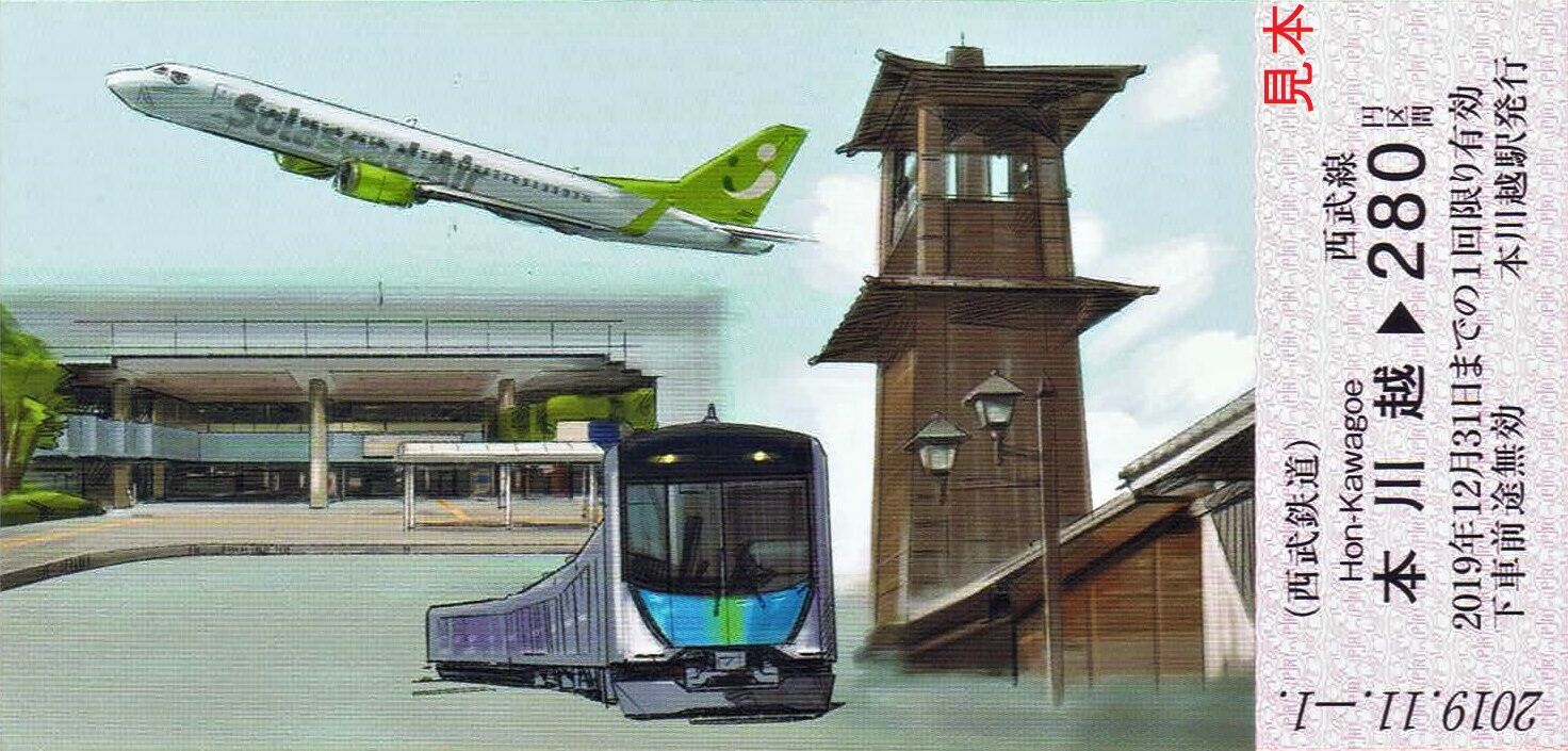 西武鉄道版は新宿線・本川越駅で発売されました。同駅から280円区間が有効な乗車券で、本川越駅舎、川越の街並みと西武鉄道40000系電車、ソラシドエアの機材のイラストによるデザインです。2,000枚限定。