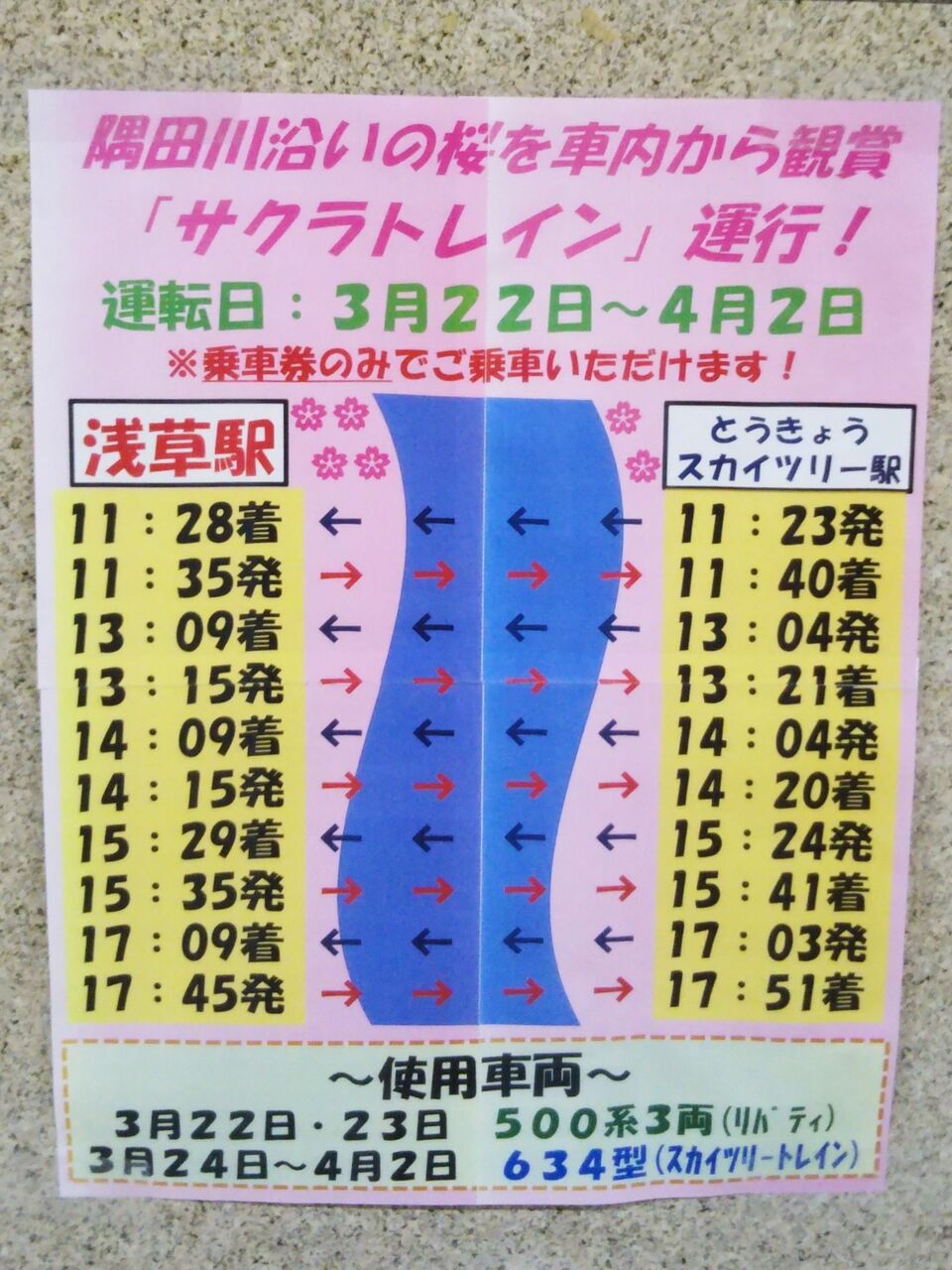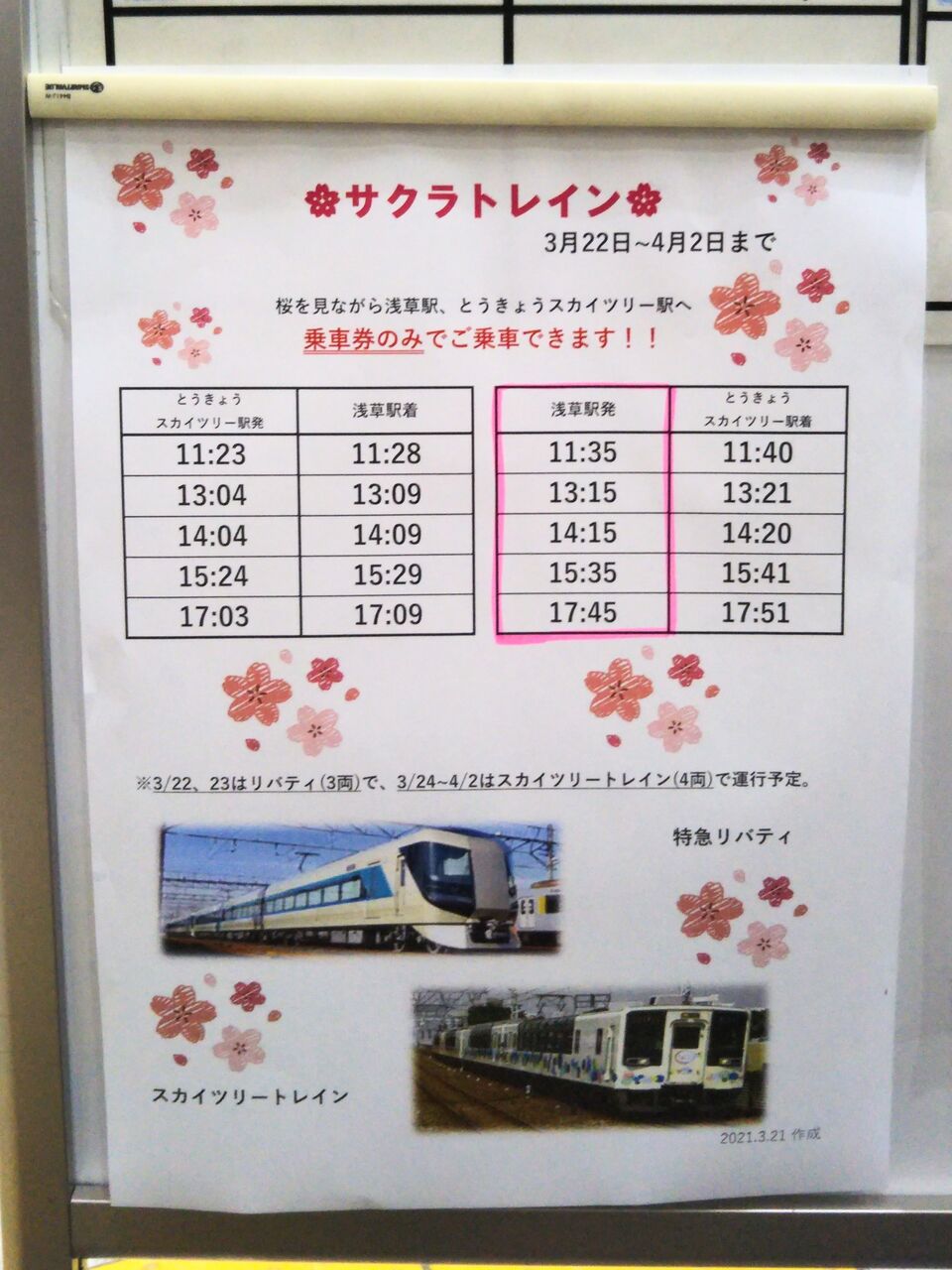 東武鉄道では桜の開花シーズンにあわせた2021年(令和3年)3月22日〜4月2日、伊勢崎線(愛称・東武スカイツリーライン)浅草〜とうきょうスカイツリー間に臨時列車『サクラトレイン』を運行しています。隅田川橋梁上でお花見のために一旦停止し、1駅の所要時j間が5〜6分と長めになっています。使用車両は500系リバティ(3月22日・23日)と634型スカイツリートレイン(3月24日〜)で、乗車券のみで乗車できます。