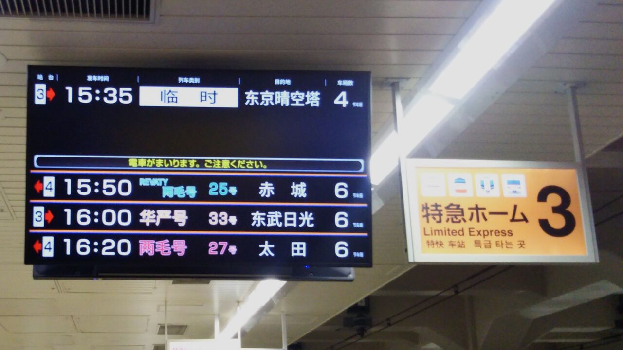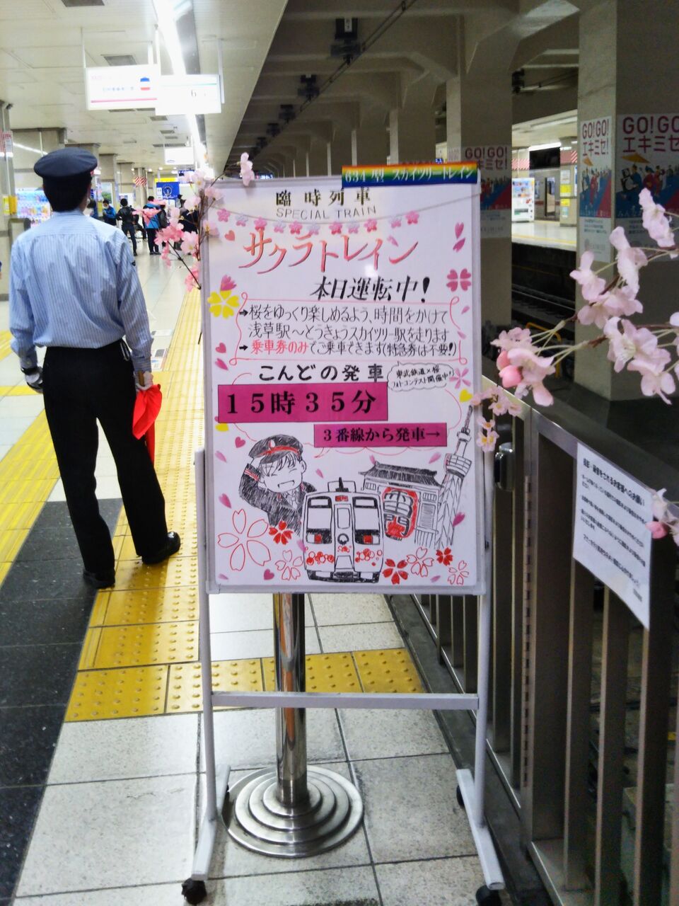 この日のサクラトレインはスカイツリートレインを使用。15時35分発の列車は特急用の3番線から発車。