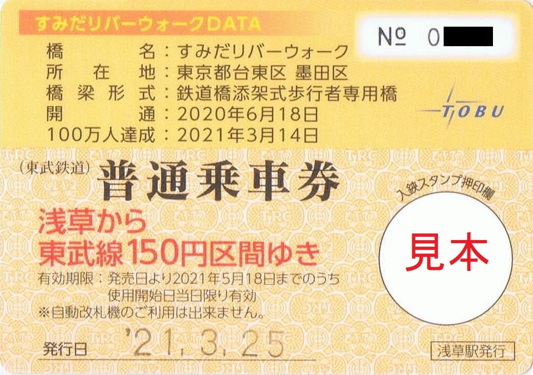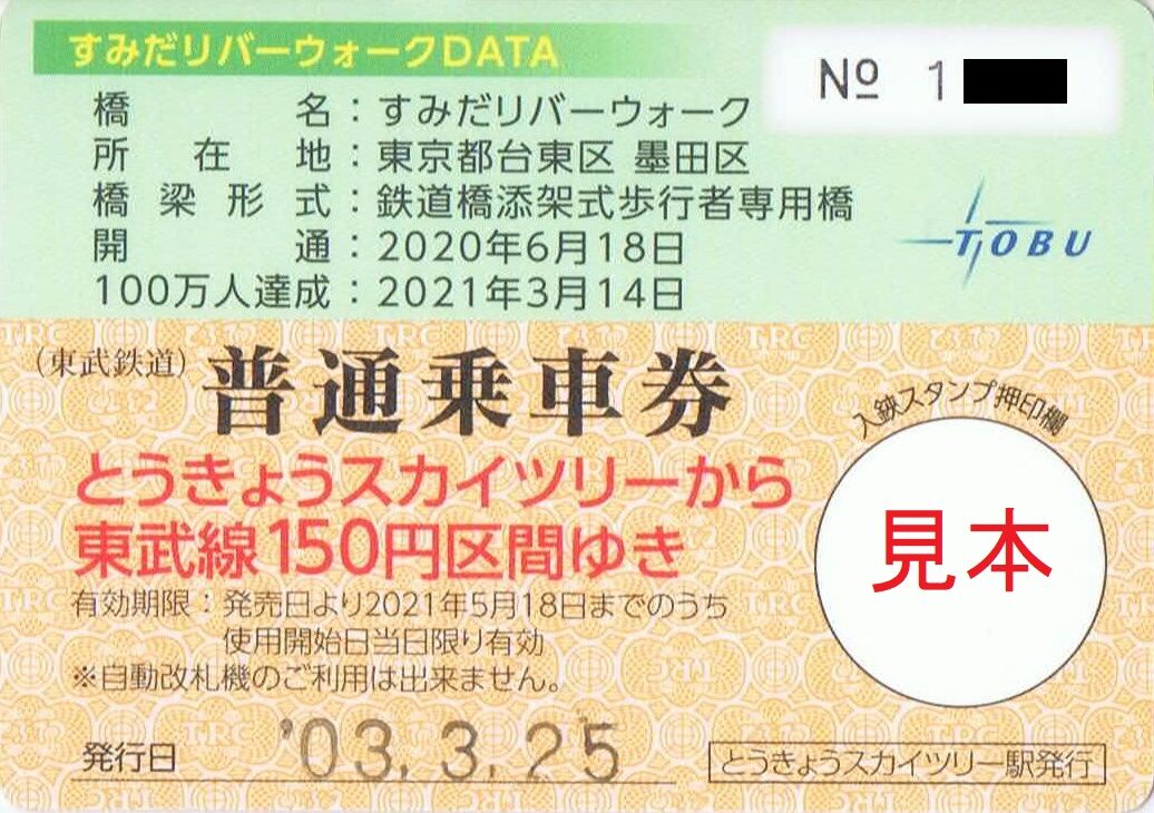 隅田川橋梁に併設された歩道橋『すみだリバーウォーク』の通行100万人達成を記念して浅草駅ととうきょうスカイツリー駅の窓口にて発売で、駅毎にデザインが異なります(全2種類で各150円。小児用は無し)。なお、3月25日のサクラトレイン乗車時には同列車内で2種類とも発売していました。また、同日、下り方面のサクラトレイン発車前には浅草駅改札内でも発売していました。