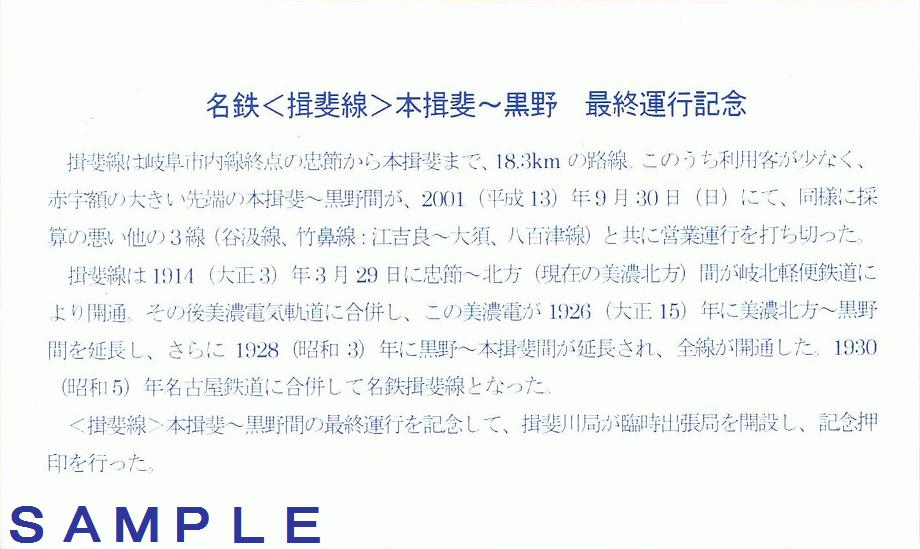 《名鉄揖斐線本揖斐~黒野最終運行記念カバー(平成13年)》