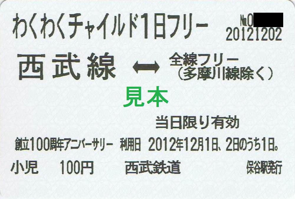 平成24年11月25日に開催された『西武鉄道100年アニバーサリーイベント in 保谷 〜SL5号蒸気機関車修復完成記念披露会〜』の会場にて発売され、平成24年11月27日〜12月2日の予定で一般発売されている小児専用の1日乗車券。多摩川線を除く西武線全線で有効。1枚100円で、池袋・所沢・飯能・高田馬場・国分寺にて発売。