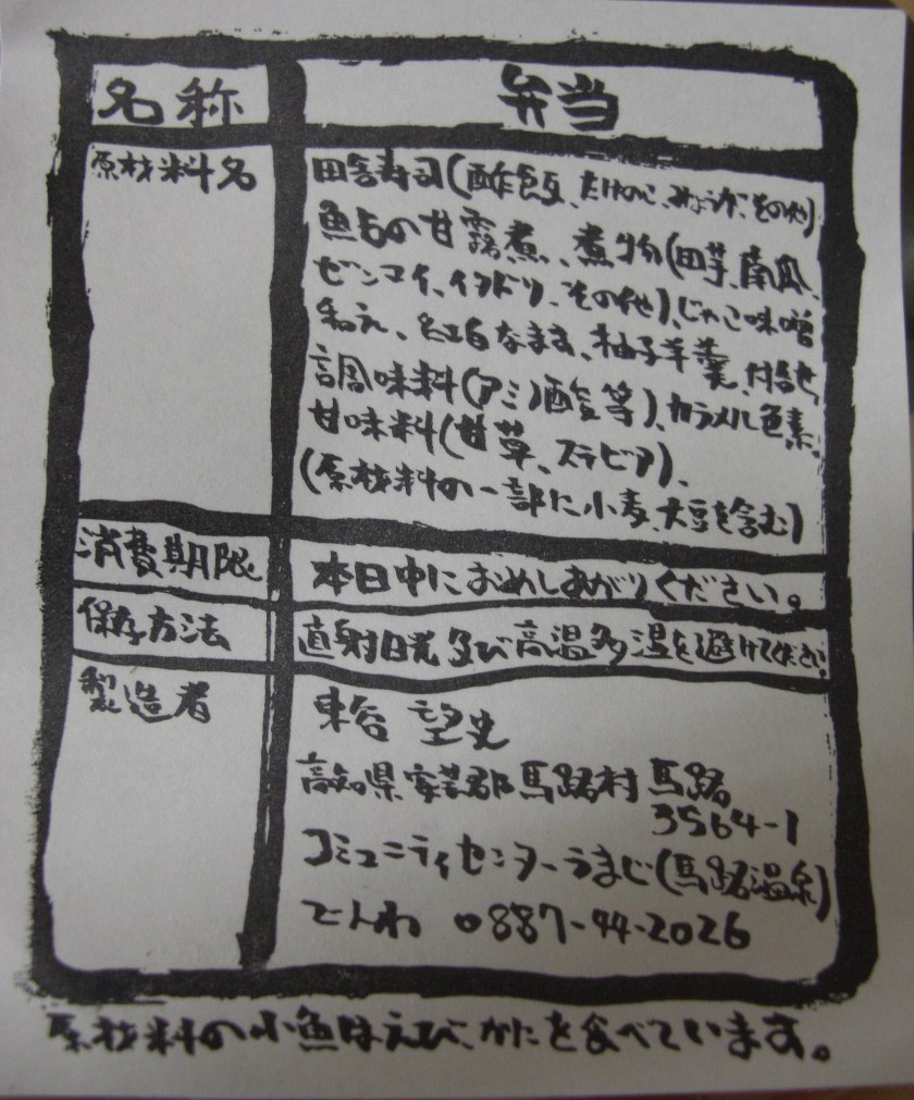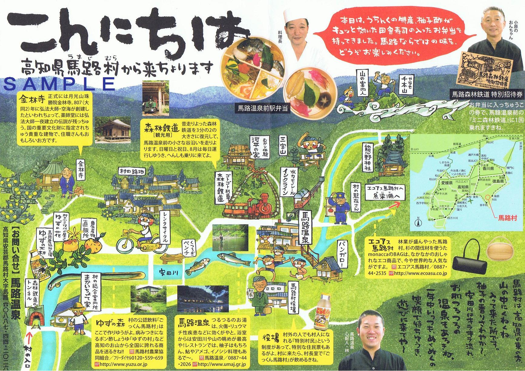 掛紙はありませんが、弁当と馬路村を紹介したチラシ(写真右)が付きます。魚梁瀬地区の魚梁瀬森林鉄道保存施設が地図上で省略されている点が少し気になります。