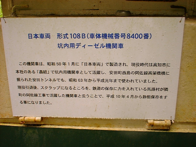 馬路森林鉄道沿いに静態保存されている日本車両製の日本鉄道建設公団阿佐線(完成後は譲渡され土佐くろしお鉄道阿佐線=愛称:ごめんなはり線)建設工事用の機関車。
