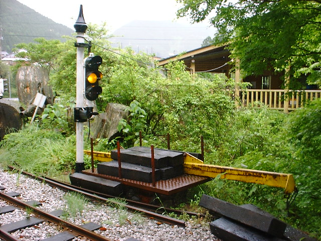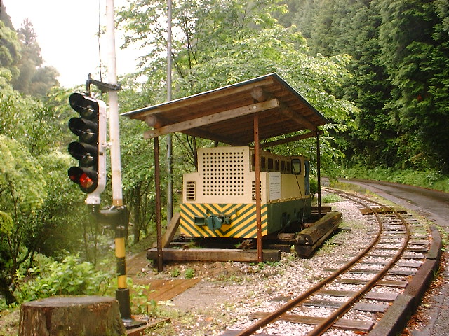馬路森林鉄道はループ状の軌道を走行する遊戯施設扱いのミニ鉄道ですが、川沿いを走行し橋を渡るなど本物の森林鉄道風のルート設定が魅力的です。変わった見所としては、のりばを出発してすぐに馬路温泉前の道路から90度向きを変えて進むあたりの軌道が道路沿いに敷設されている点で、遊戯施設とは思えない素晴らしい風景。