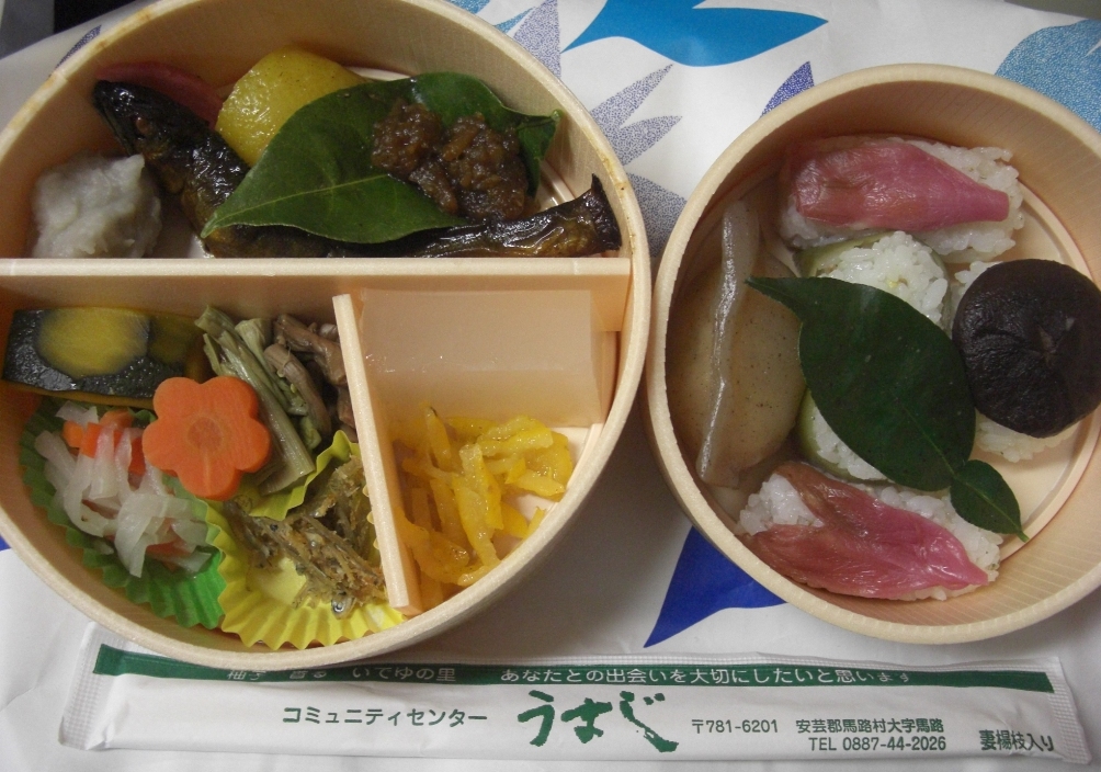 京王百貨店新宿店第45回元祖有名駅弁と全国うまいもの大会に特別出店された馬路村の村おこし弁当。馬路森林鉄道のりば前にあるコミュニティセンターうまじ(馬路温泉)の調整です。鮎の甘露煮と野菜を使った田舎寿司や煮物が中心ですが、デザートには柚子ようかんが、田舎寿司の酢飯にも柚子が使われています(柚子は馬路村の特産品)。
