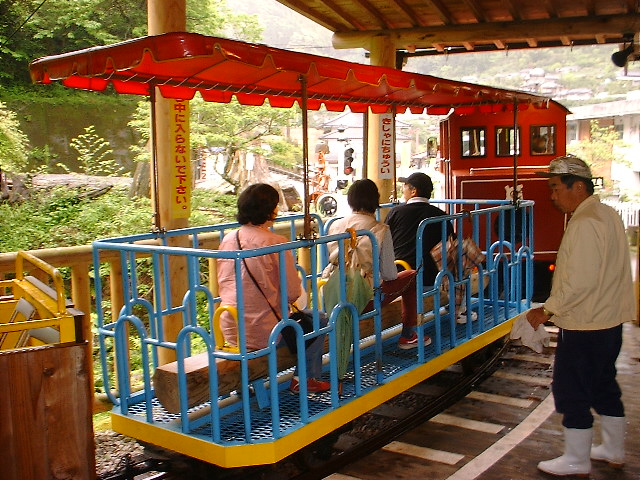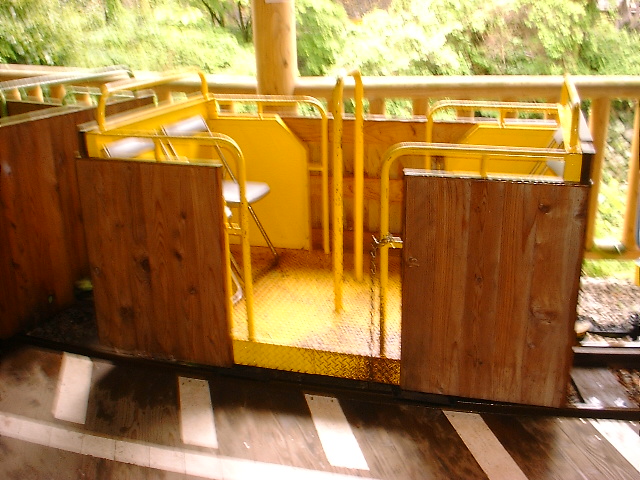 客車はオープンタイプが2種類。写真右上の水色客車は跨って座るタイプなので、馬路温泉駅前弁当を食べるのは無理。写真左の黄色客車でも、乗車時間中に完食は厳しそう。