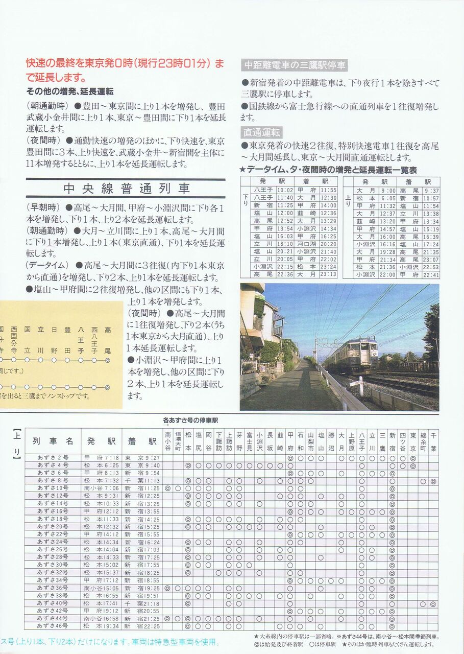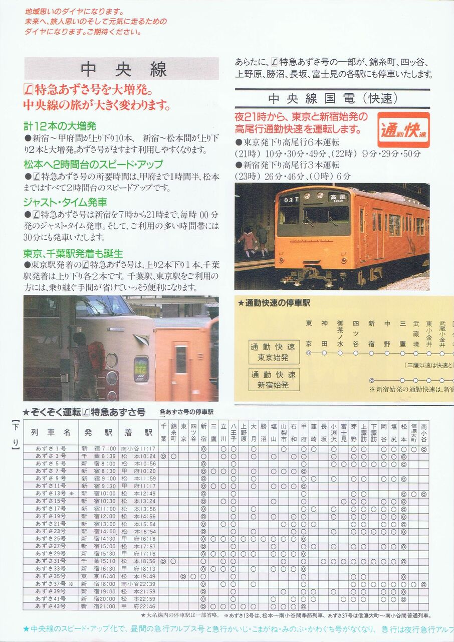 内側には中央線特急あずさ号増発・スピードアップ化の概要、中央線国電(快速)における通勤快速運転、中央線普通列車の増発等に関する記載。ここで使用されている写真の列車も今のJR東日本では見られない201系、115系電車。【関連記事】