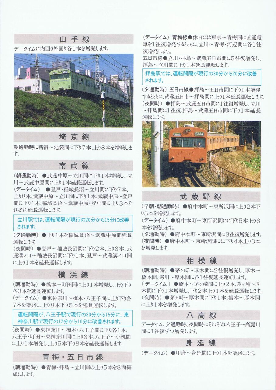 外側裏面には山手線、埼京線、南武線、横浜線、青梅・五日市線、武蔵野線、相模線、八高線、身延線の増発等に関する記載があります。山手線、青梅線の写真には当時の主力である103系電車。特に青梅線103系は今では珍しい非冷房車。