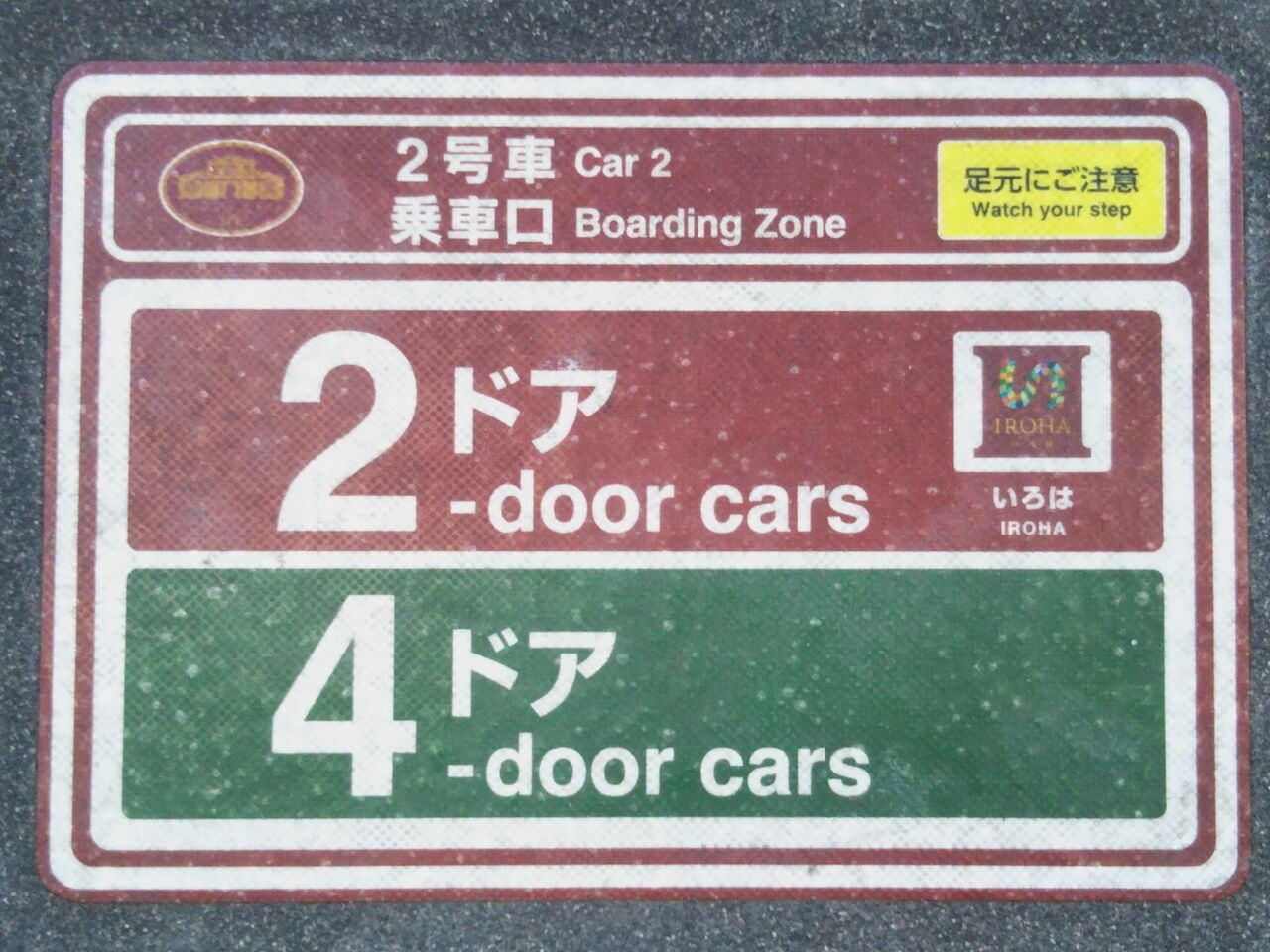 日光駅でいろは関連の写真を撮影。ホーム上に印刷されている乗車位置表示。2号車の2ドア(いろは)と4ドア車の両方を表示しています。