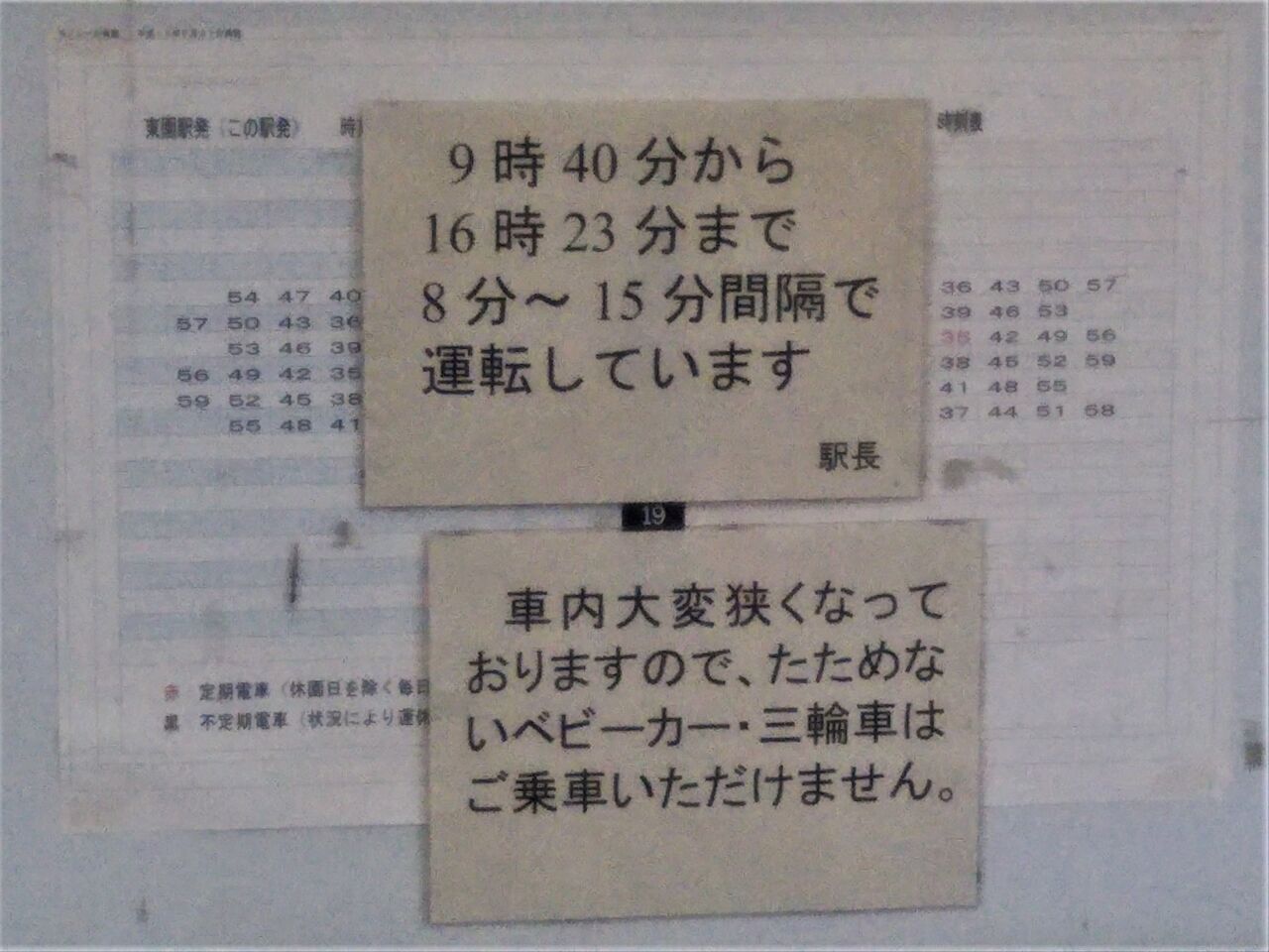 写真右は東園駅最終日の時刻等に関する掲示で、9時40分から16時23分まで8〜15分間隔で運転と記載されていました。