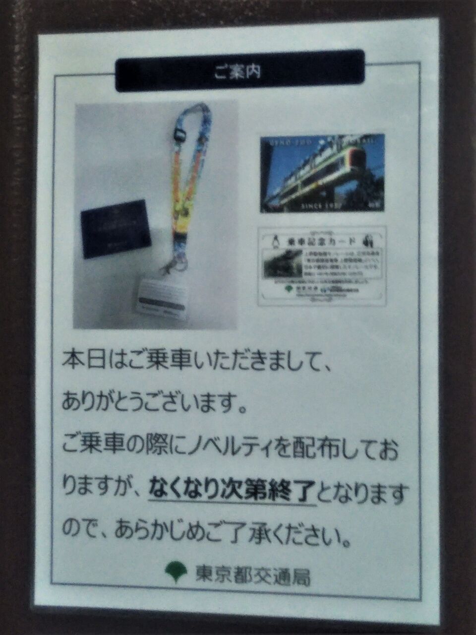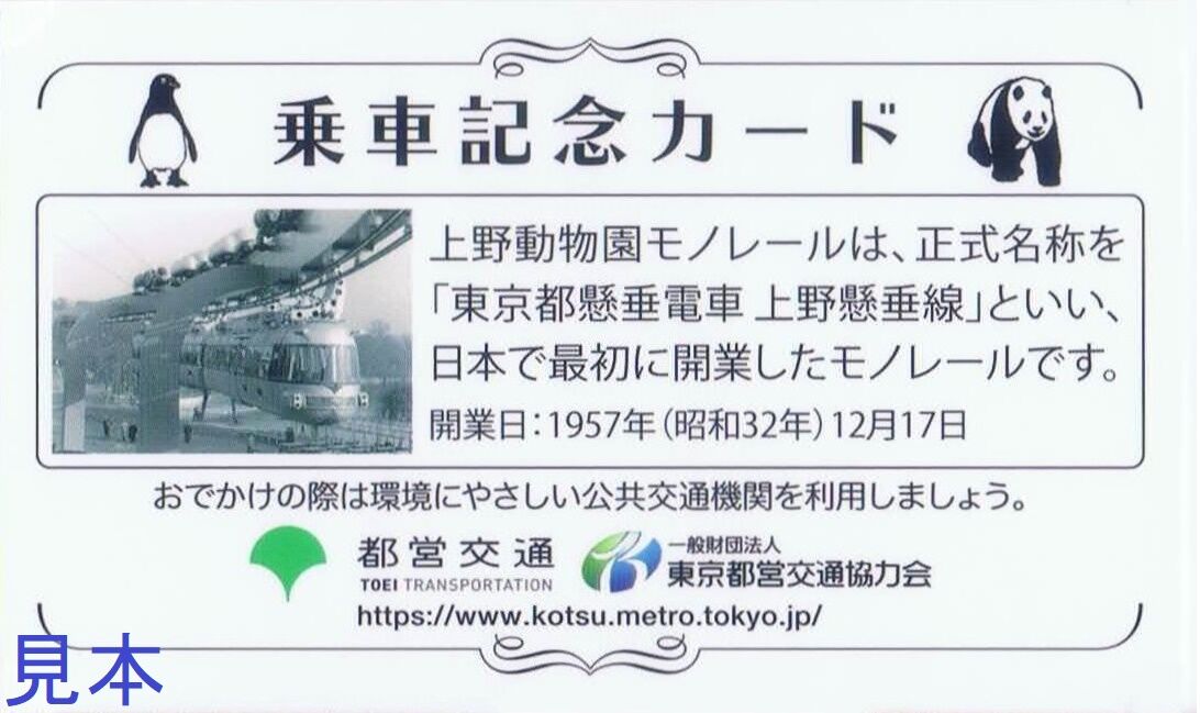 ノベルティ関連では後述のカードが『東京都懸垂電車』まで含む『上野懸垂線』で、こちらは『上野動物園モノレール』。本路線関連の東京都のリリースでは『恩賜上野動物園モノレール』『上野動物園モノレール』。休止直前の東園駅舎内の掲示物には『恩賜上野動物園モノレール』『上野動物園モノレール』『上野モノレール』と路線名以外に様々な通称が使用されていました。