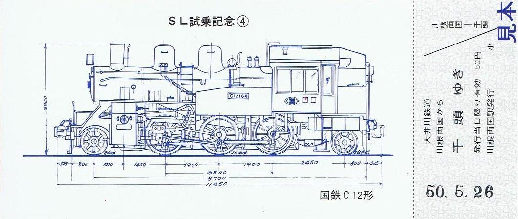 リバーサイド線で小運転されていたSLの側面図を使用しているようです。当時は国鉄より本川根町に貸与されており、現在では日本ナショナルトラスト所有となっているC12164も描かれています。