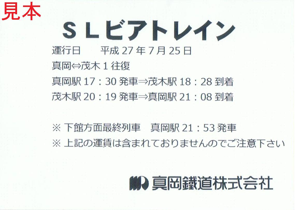 2015年(平成27年)のSLビアトレイン参加証の表面と裏面です。本券は湘南モノレール江の島線湘南江の島駅舎内で開催された『第一回モノレールサミット』に出店された真岡鐵道のブースにて販売されていました。座席指定となっており、号車、座席番号が印刷済です。