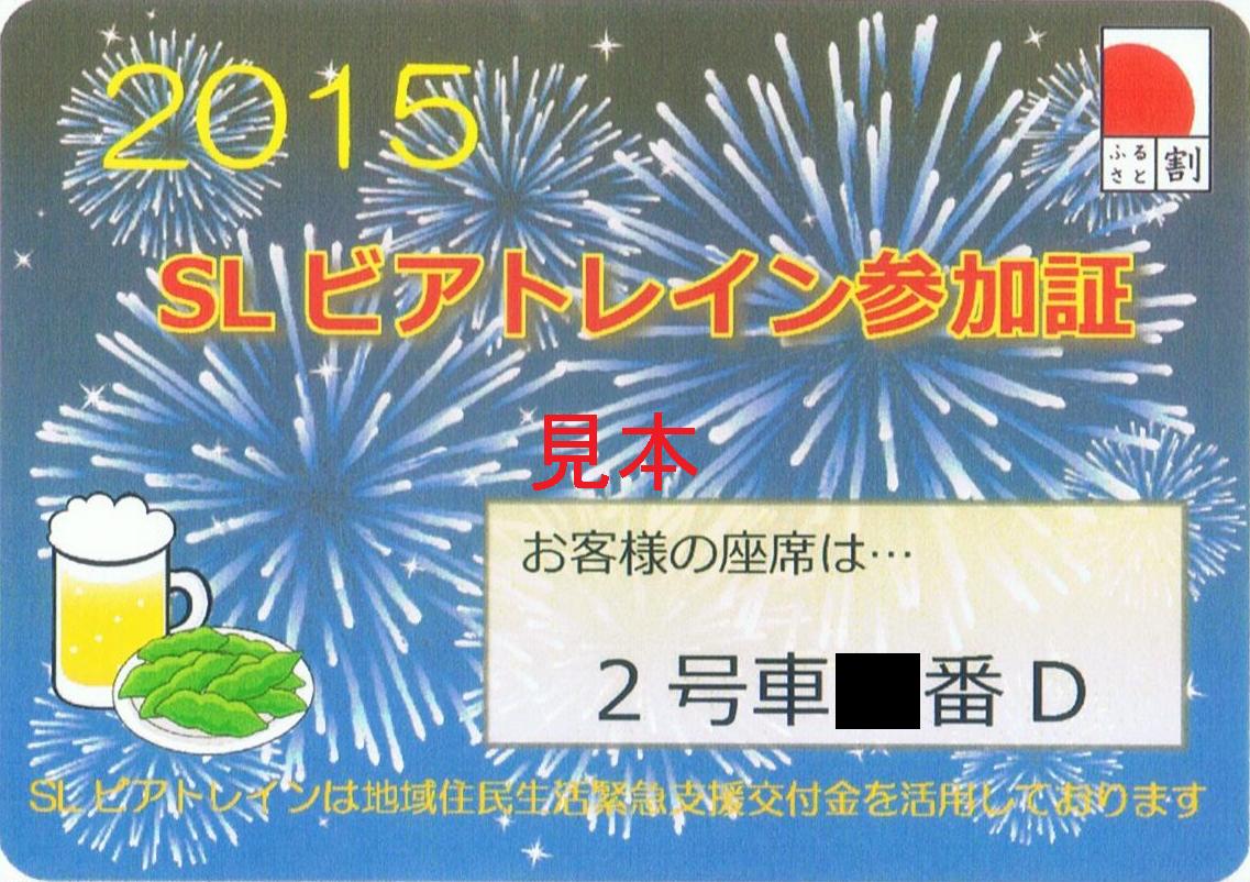 2015年(平成27年)のSLビアトレイン参加証の表面と裏面です。本券は湘南モノレール江の島線湘南江の島駅舎内で開催された『第一回モノレールサミット』に出店された真岡鐵道のブースにて販売されていました。座席指定となっており、号車、座席番号が印刷済です。【関連記事】