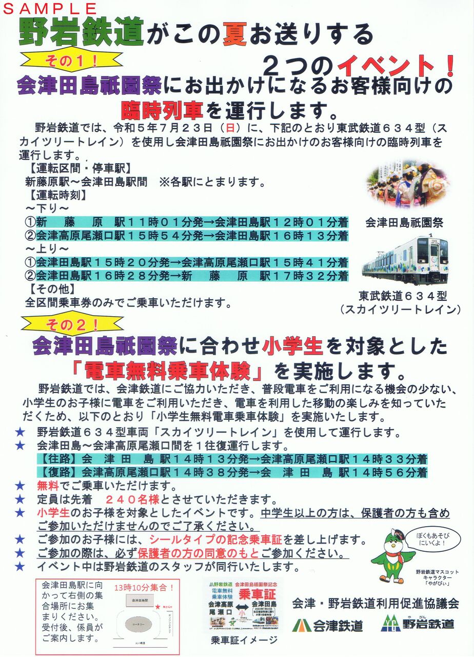 《野岩鉄道 会津田島祇園祭臨時列車/「電車無料乗車体験」チラシ(令和5年7月23日)》