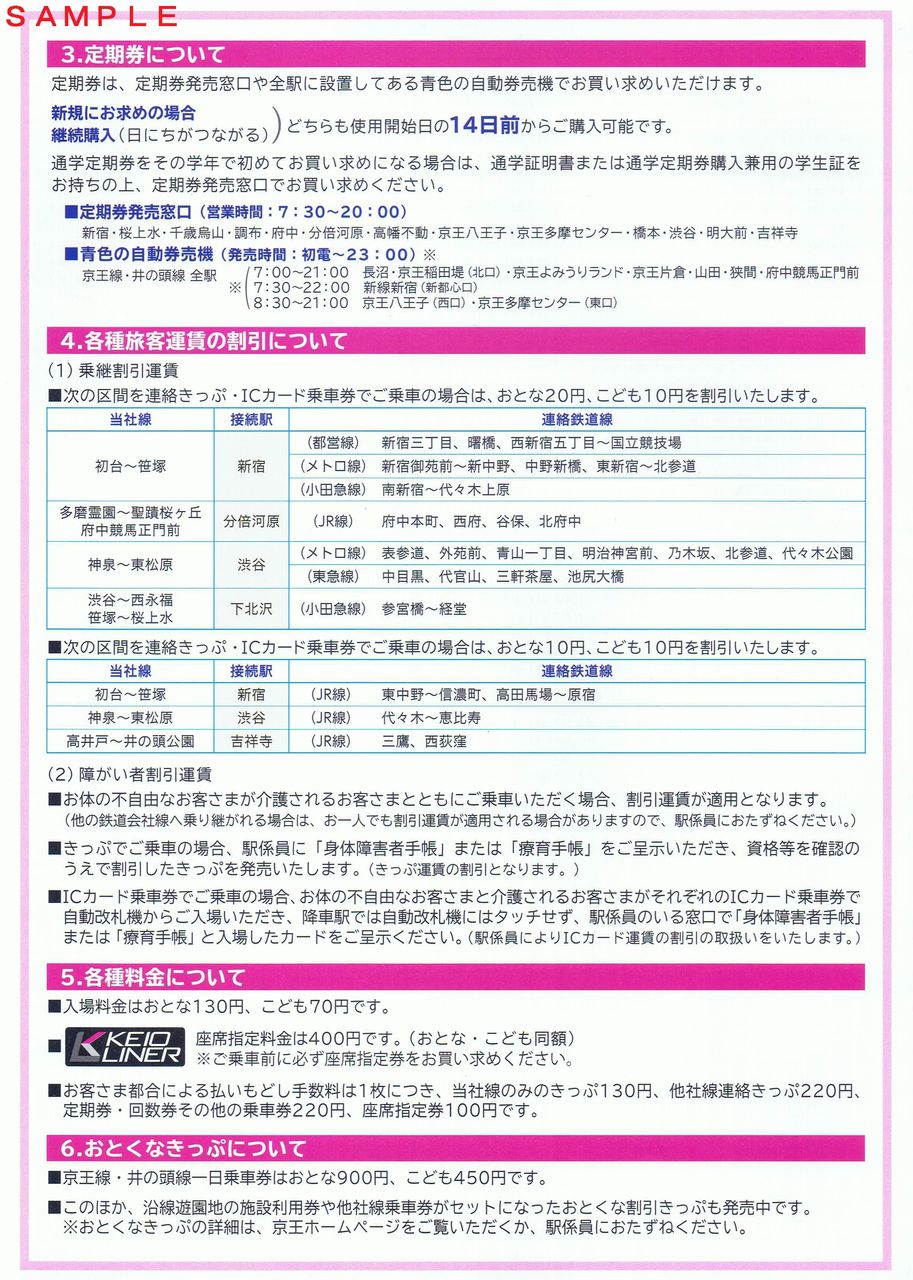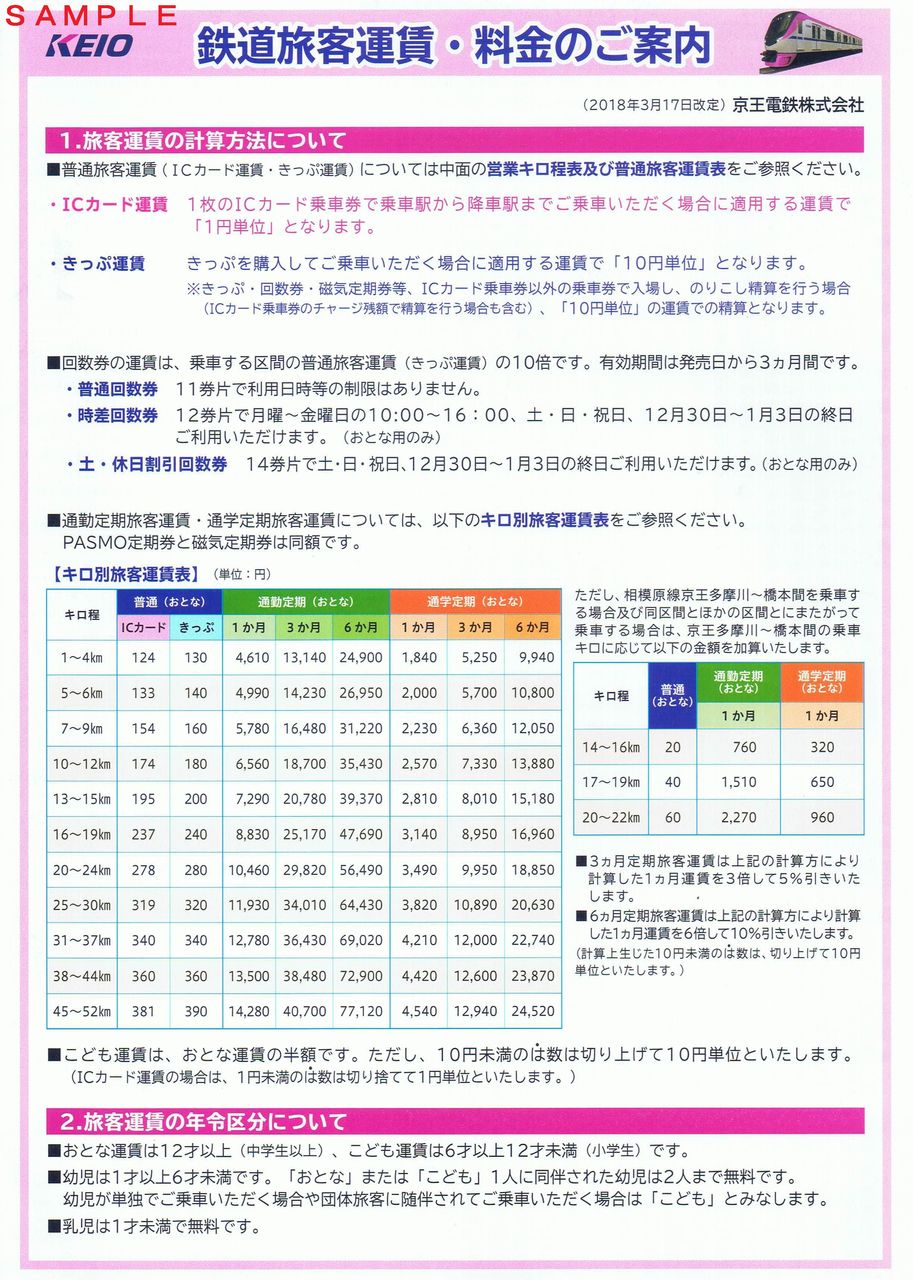 2018年ダイヤ改正後から配布開始されたA4サイズのご案内で4頁。内側の2・3頁目に京王電鉄全線の運賃表が掲載されています。1頁目(写真左)の上部に5000系、4頁目(写真右)には京王ライナーの料金について記載されています。======================================