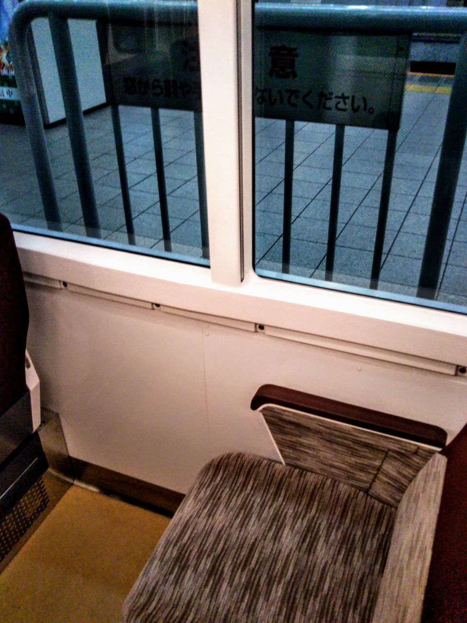座席は中間列のD席。今までの乗車がA席2回、C席1回なので気づきませんでしたが、(今のところ下り方面しか運行されていませんが、そちらを前向きとした)中間列D席の場合、御覧の様な位置に窓柱がきてしまいます。ちょうど斜め前方の景色を見るのにちょっと気になる位置です。