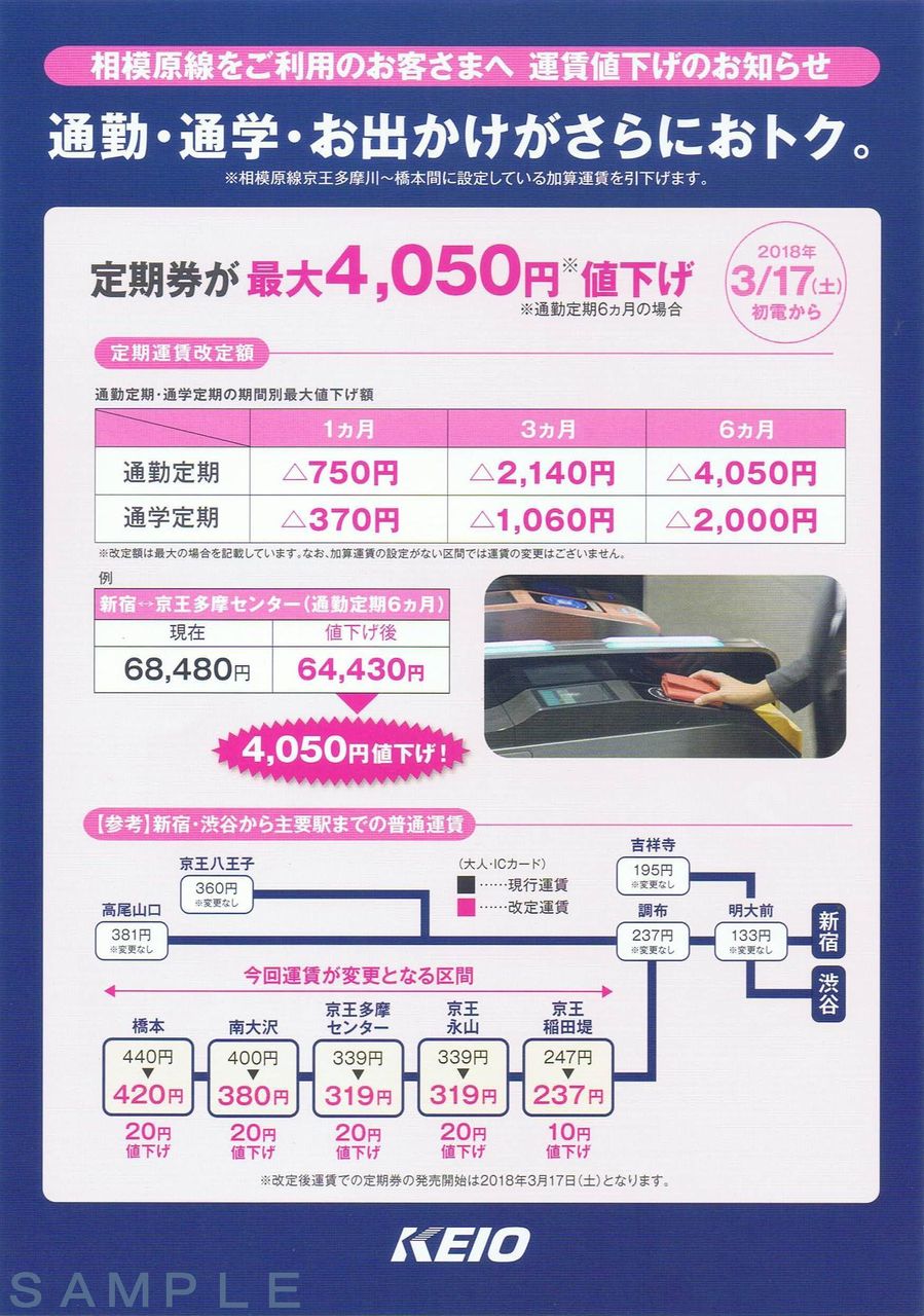 ダイヤ改正後の3月から配布開始されたパンフレット。内容は定期券・京王ライナー利用可能なクレジットカードブランド拡大、定期券らくはや予約サービス、運賃値下げのお知らせ。
