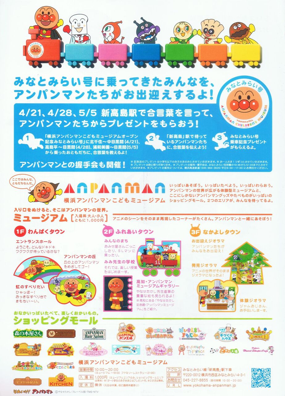 横浜アンパンマンこどもミュージアムオープンを記念して、4月21日に日比谷線ルート(東急1000系使用)、4月28日に三田線ルート(東京都6300形使用)、5月5日に埼玉高速・南北線ルート(埼玉高速2000系使用)のみなとみらい号が各1往復運行されました。写真は5社局が発行したチラシの表面と裏面です。【関連記事】