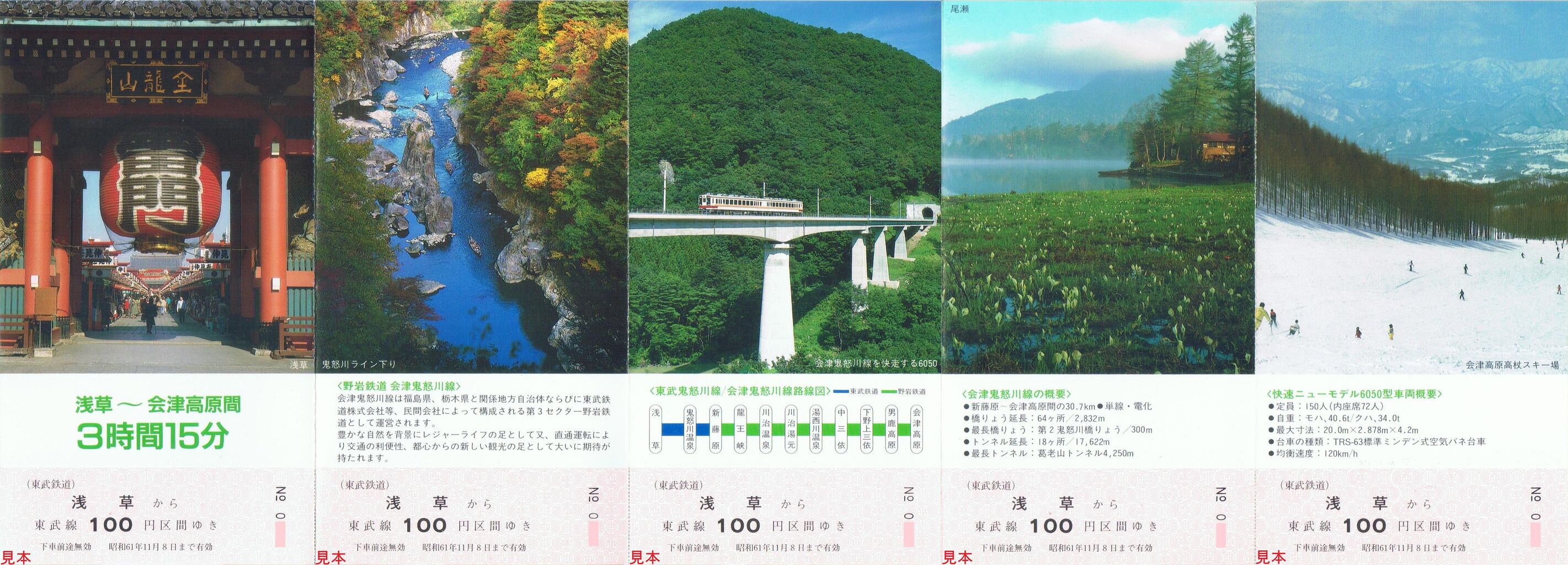 使用写真は6050系・350系使用の急行南会津号並びと川治湯元駅付近。南会津号は平成17年に廃止されています。《野岩鉄道相互直通運転30周年記念乗車券(平成28年10月9日)》