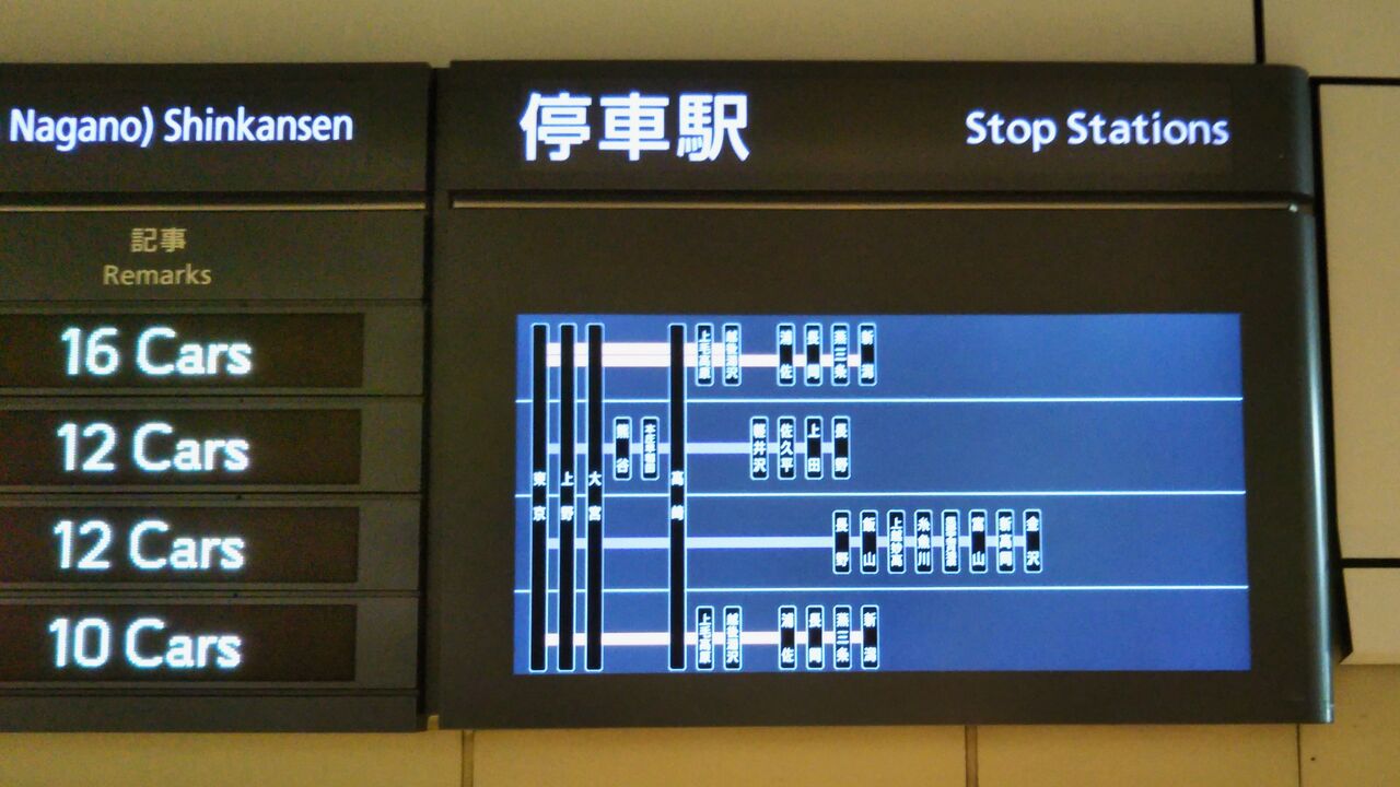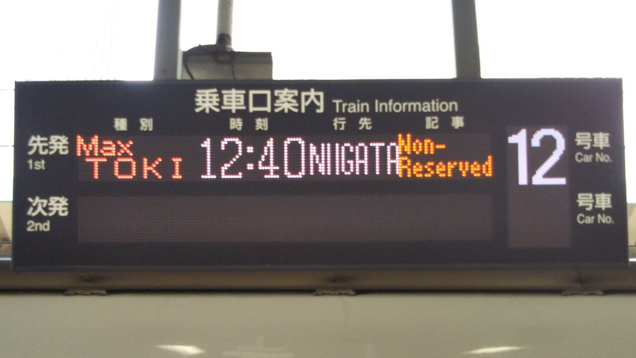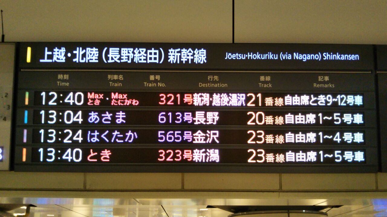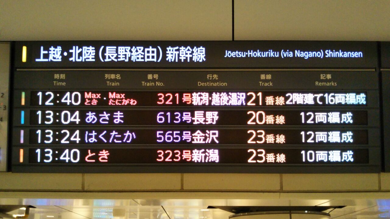 東京〜越後湯沢間でMaxたにがわ321号と併結し、16両編成で運行されるMaxとき321号の写真。Maxとき321号が新潟寄りの8両。東京駅構内の案内表示各種。1階・改札内。