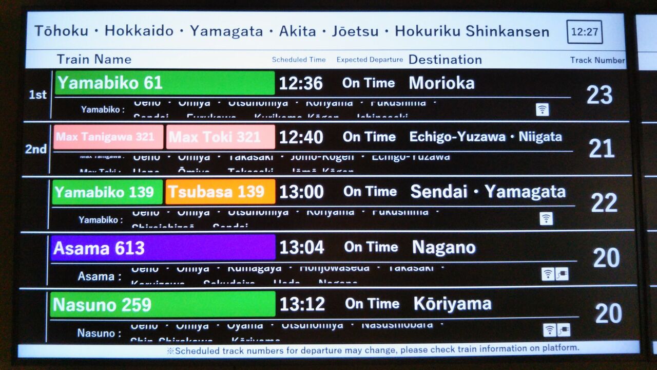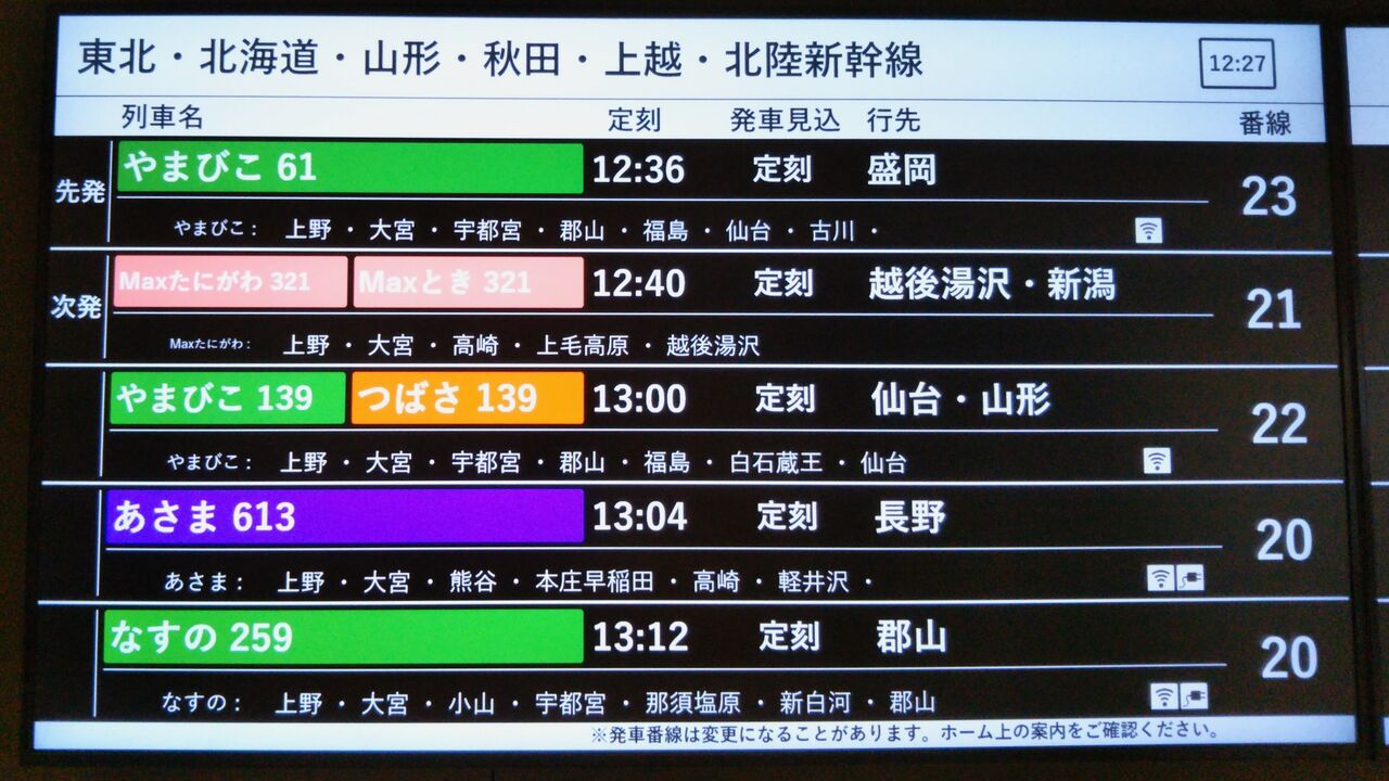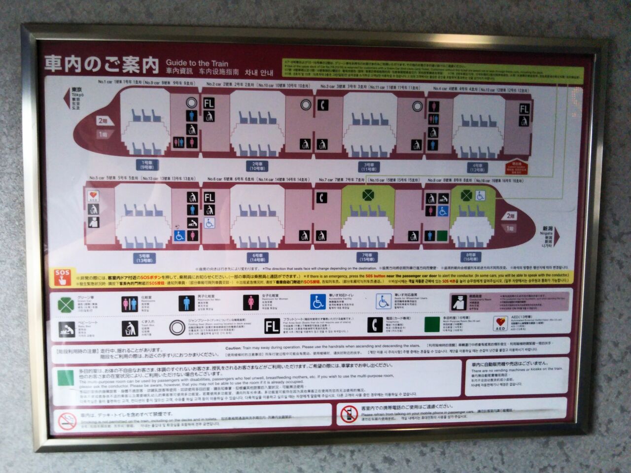 東京〜越後湯沢間でMaxたにがわ321号と併結し、16両編成で運行されるMaxとき321号の写真。Maxとき321号が新潟寄りの8両。東京駅構内の案内表示各種。1階・改札内。