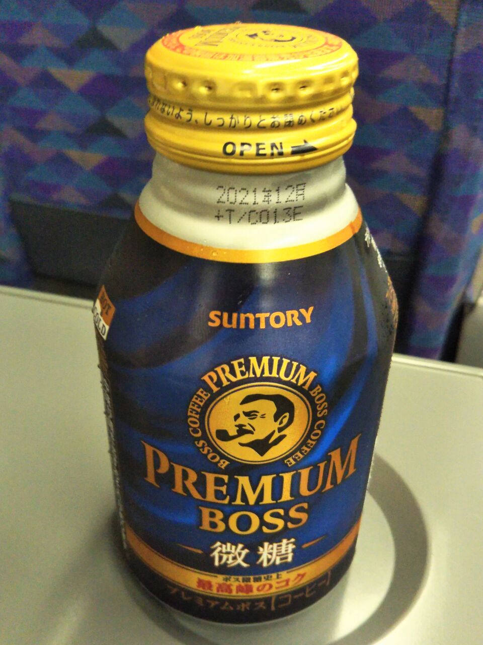 新潟県北蒲原郡聖籠町(せいろうまち)の株式会社しばうま本舗が製造した洋なし(ル・レクチェ)の焼きドーナツ。ICカード利用割引適用後で1個・税込み180円。車内販売の規模は縮小されたものの、沿線の特徴・特産品を使用した商品を取り扱っている点は非常に有難いものです。洋なしのほのかな酸味が良いアクセントになっています。《サントリー プレミアムボス ―微糖―》