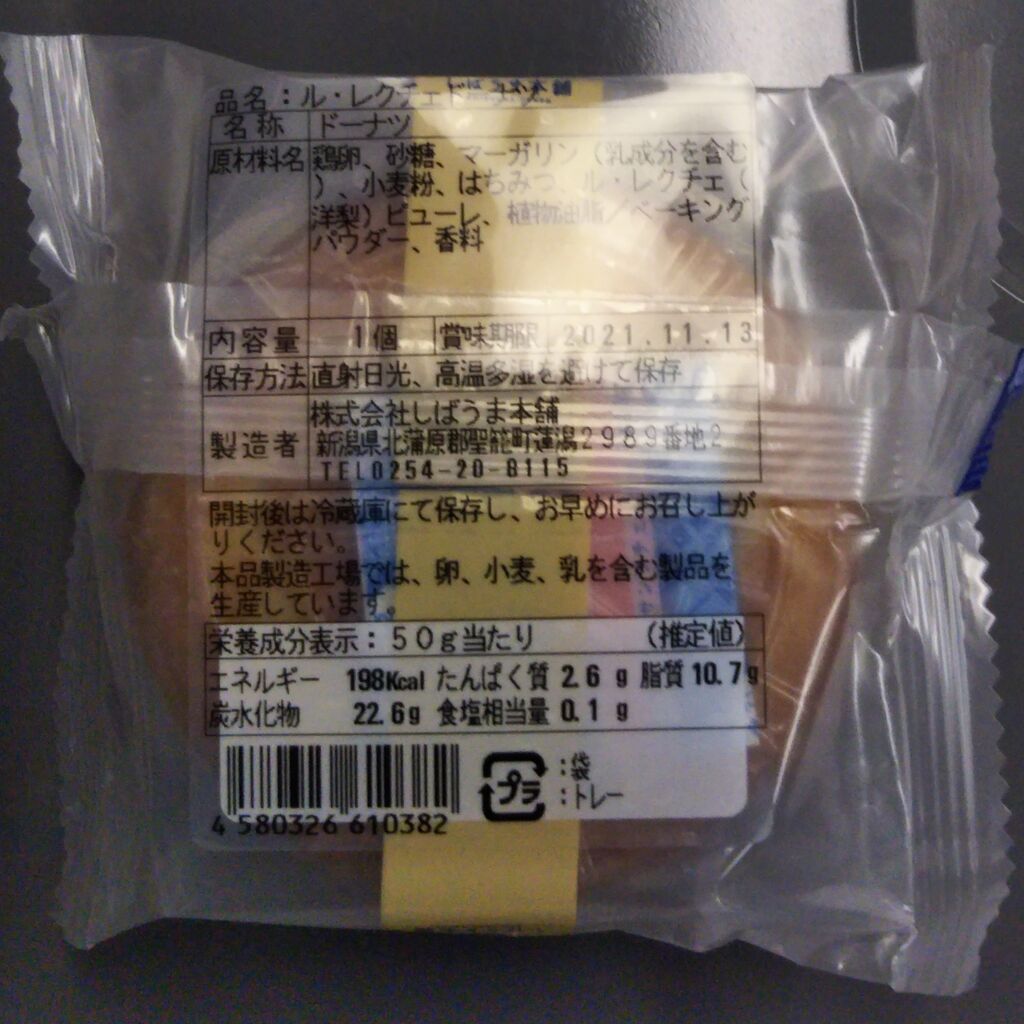 新潟県北蒲原郡聖籠町(せいろうまち)の株式会社しばうま本舗が製造した洋なし(ル・レクチェ)の焼きドーナツ。ICカード利用割引適用後で1個・税込み180円。車内販売の規模は縮小されたものの、沿線の特徴・特産品を使用した商品を取り扱っている点は非常に有難いものです。洋なしのほのかな酸味が良いアクセントになっています。