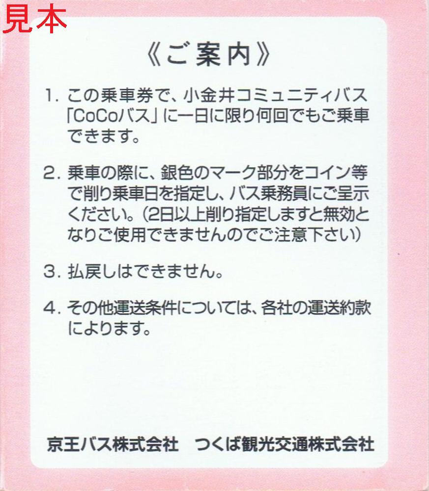 2024年(令和6年)9月時点で発売されているCoCoバス関連の乗車券で最安のもの。大人・小児共通で1枚500円です。写真は外側の表面と裏面で、京王バス発行のものについては券番の頭にアルファベット『K』の文字が付いています。内側がスクラッチ面となっており、京王バスについては発売時に『年』『月』『日』のいずれもスクラッチ部分を削られない状態で渡されます。======================================