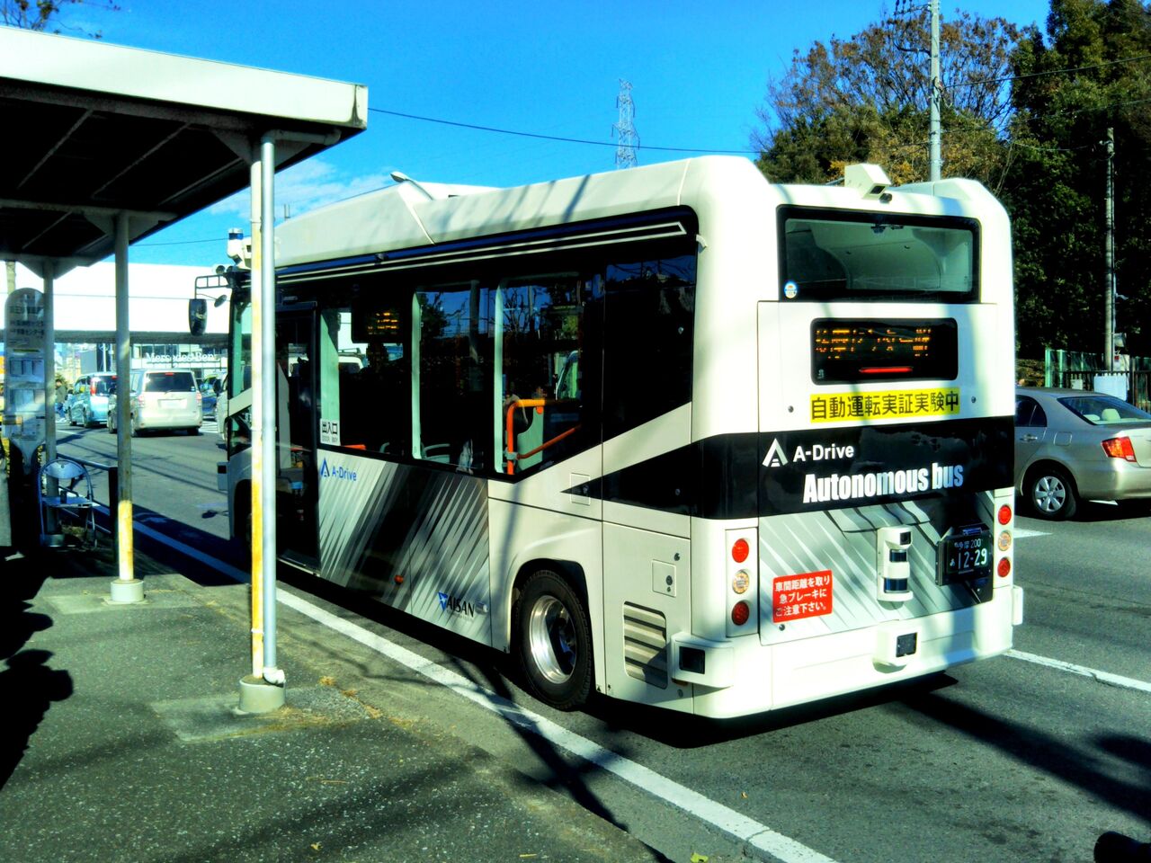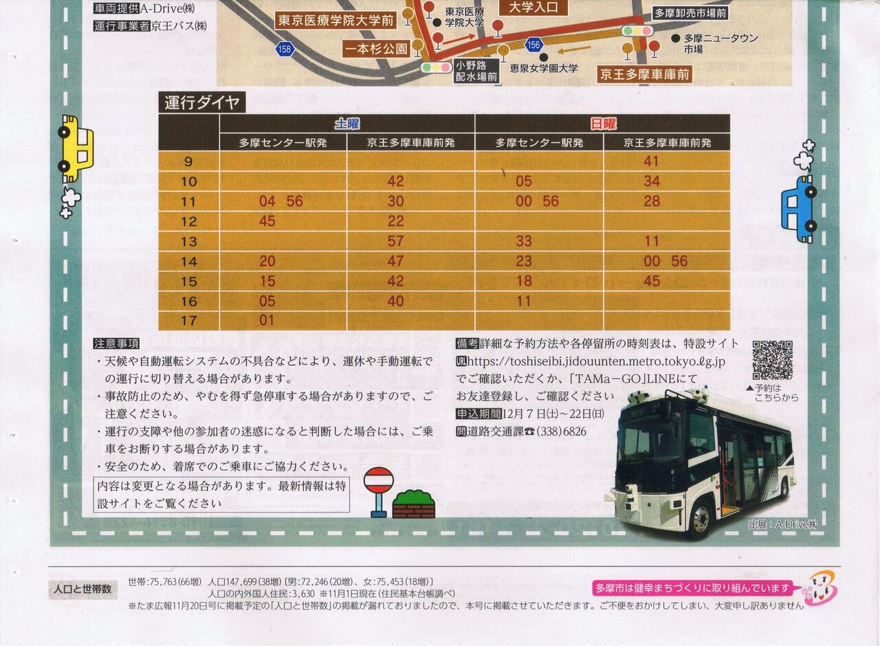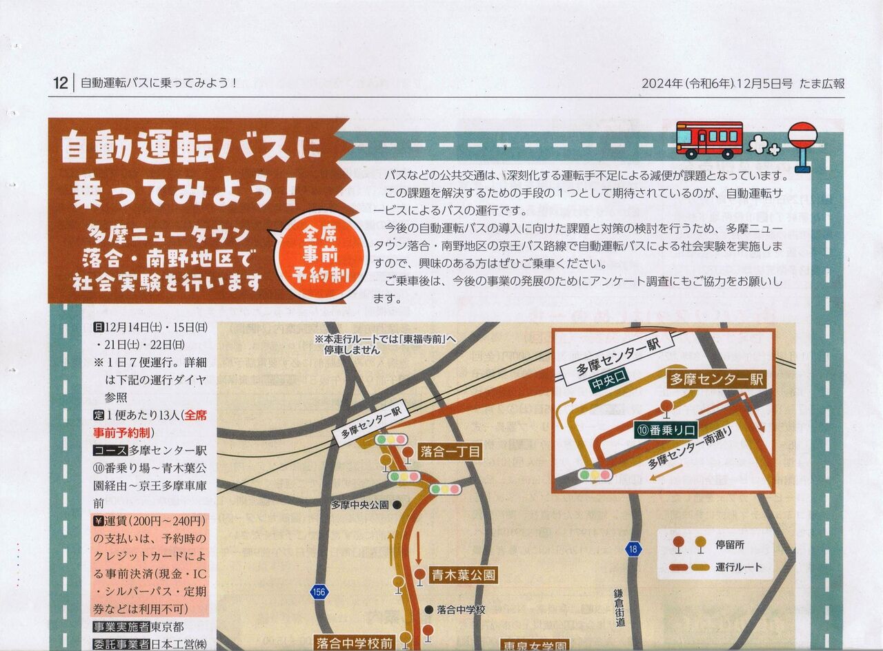 東京都(事業実施者)、日本工営(委託事業者)、京王バス(運行事業者)は2024年(令和6年)12月14・15・21・22日、多摩市多摩センター駅周辺地域の京王バス青木葉線(多摩センター駅〜青木葉公園〜一本杉公園〜恵泉女学園大学入口〜京王多摩車庫前)にて自動運転バスによる社会実験を実施しています。東京都の『令和6年度自動運転サービスの導入推進に向けた走行環境整備に関するプロジェクト』の一環として東京都内3地域(他に杉並区荻窪駅南側地域、瑞穂町箱根ケ崎駅周辺地域)で実施される自動運転のひとつで、A-Drive株式会社(三菱商事株式会社とアイサンテクノロジー株式会社の合弁会社)が提供する車両・Minibus(乗車店員13名)を使用しています。