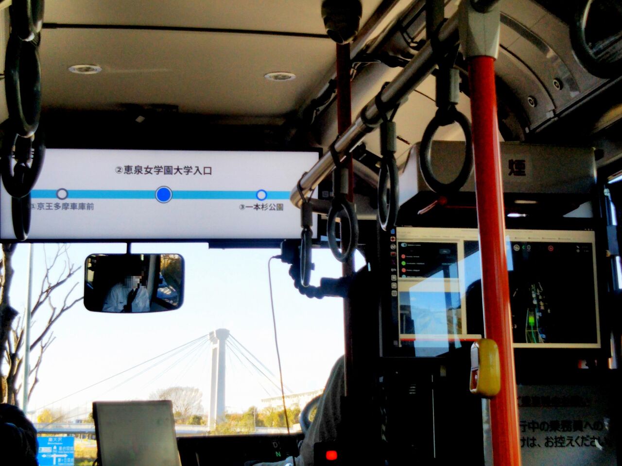 車内前方のモニターに行き先案内や停留所名が表示されている時は自動運転中。京王多摩車庫前から恵泉女学園大学までは尾根幹線を走行。この道路、東京オリンピック以降は毎年、自転車ロードレースが開催されるようになり、その影響だと思いますが競技用自転車の練習ルートの様になっています。土日には多数のサイクリストが見られますが、全ての方がスムーズかつ安全に走行している訳ではなく、中にはふらふらしている様な実力不足や、短時間でも並列走行する悪質なサイクリストもおり、昔よりも相当走りづらくなったと感じる道路です。