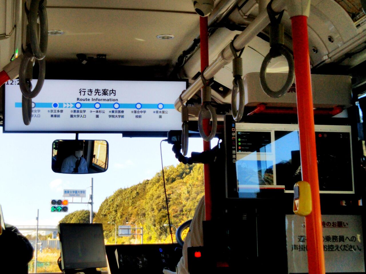 さて、前方の運転席後ろのモニターは、その先の道路が進行可能であるかをセンサーが反応して表示しているもので、緑色は進行可能、赤色は停止と判断するようです。《多摩センター駅》