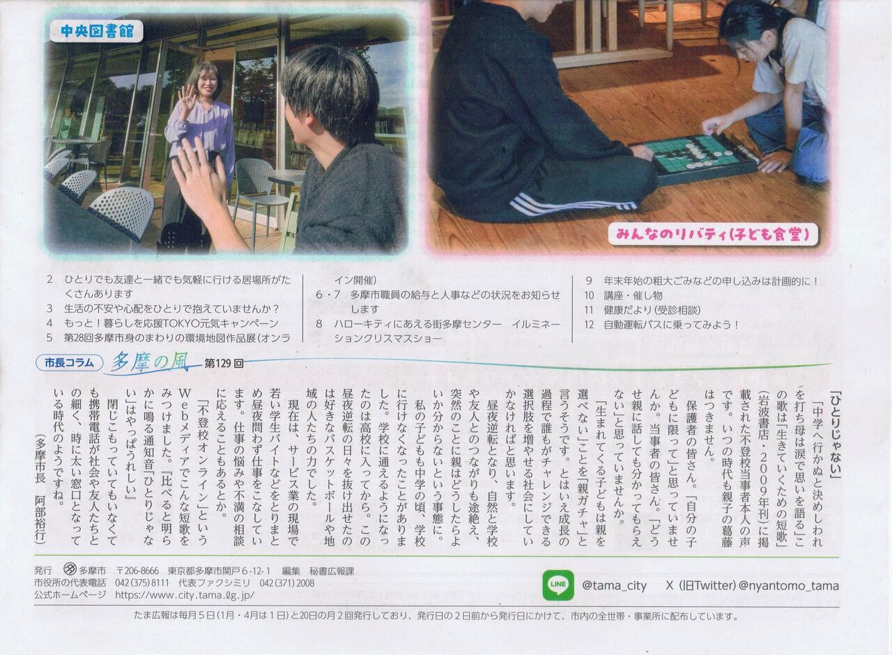 多摩市の広報誌で計12頁。写真左上・左下は1頁目。写真右上・右下は本実験について掲載している12頁。