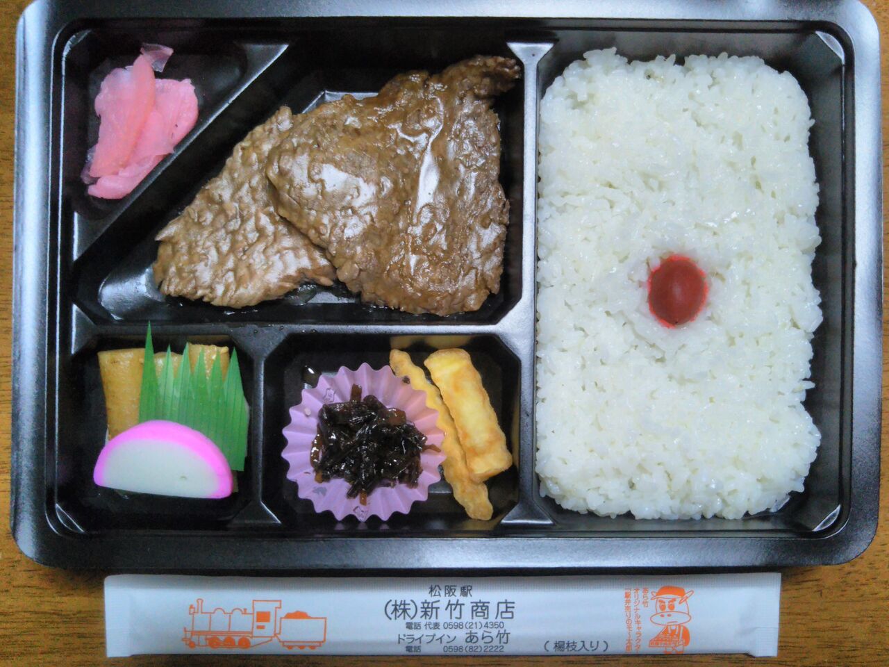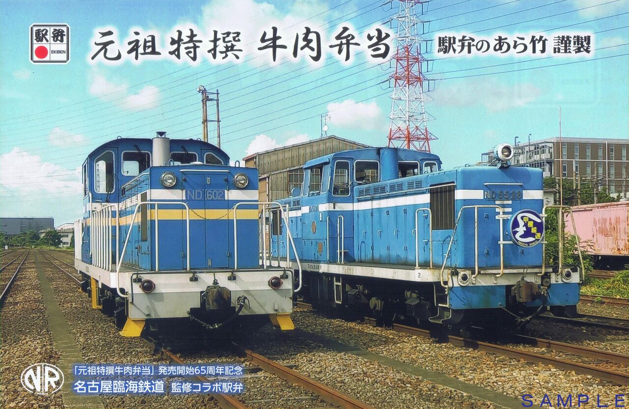「元祖特撰牛肉弁当」発売開始65周年記念企画第3弾として2024年催行の名鉄観光のツアー参加者向け弁当として登場した名古屋臨海鉄道とのコラボ駅弁で本来は松阪駅弁。これは同社の東港駅弁になると思います。写真左は掛紙でND602号車と甲種輸送ヘッドマーク付きのND5528号車。写真右は中身です。第1弾は近畿日本鉄道、第2弾は名古屋鉄道とのコラボでしたが、珍しい貨物専業の鉄道事業者とのコラボ。旅客営業を行わない事業者のグッズなどあまり無いので、この様な企画は有難いものです。