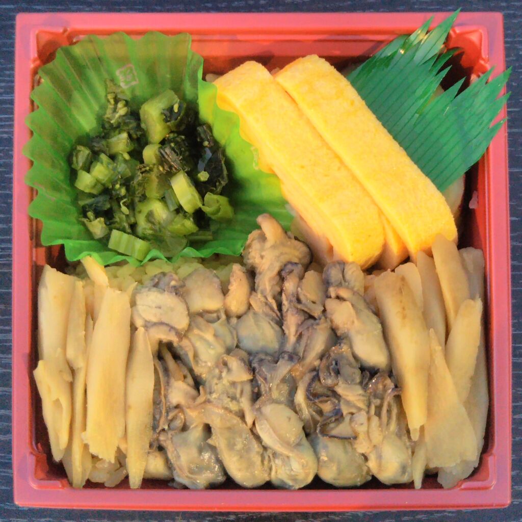 京王百貨店新宿店『第60回 元祖有名駅弁と全国うまいもの大会』前半の『がんばれ!ローカル線』企画にて実演販売されたのと鉄道七尾線能登中島駅の駅弁。 能登中島駅売店を運営する駅マルシェわんだらぁずの調製で税込1,680円。写真左は掛紙、右は中身です。小さめですが濃厚な牡蠣の美味しさが口いっぱいに広がります。なお、同時期の京王大会には高野商店調製の北陸新幹線加賀温泉駅弁『輪島朝市弁当』(実演・税込1,300円)も販売されており、あちらも牡蠣入りの弁当で内容的に少し競合しています。何かもう一品おかずが入っていれば良いと思いました。