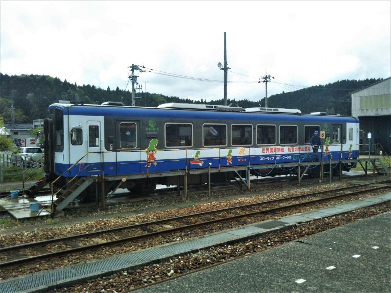 現在の主力車両NT200形。写真右はのとりあーな(穴水町のイメージキャラクター)の部分ラッピングが施されたNT213号車。