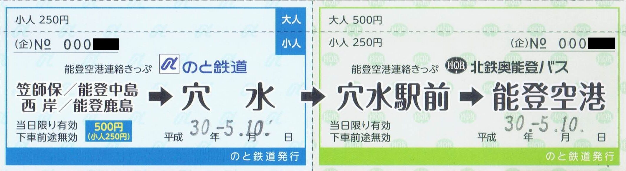 《のと鉄道発行 のと鉄道能登空港連絡きっぷ》
