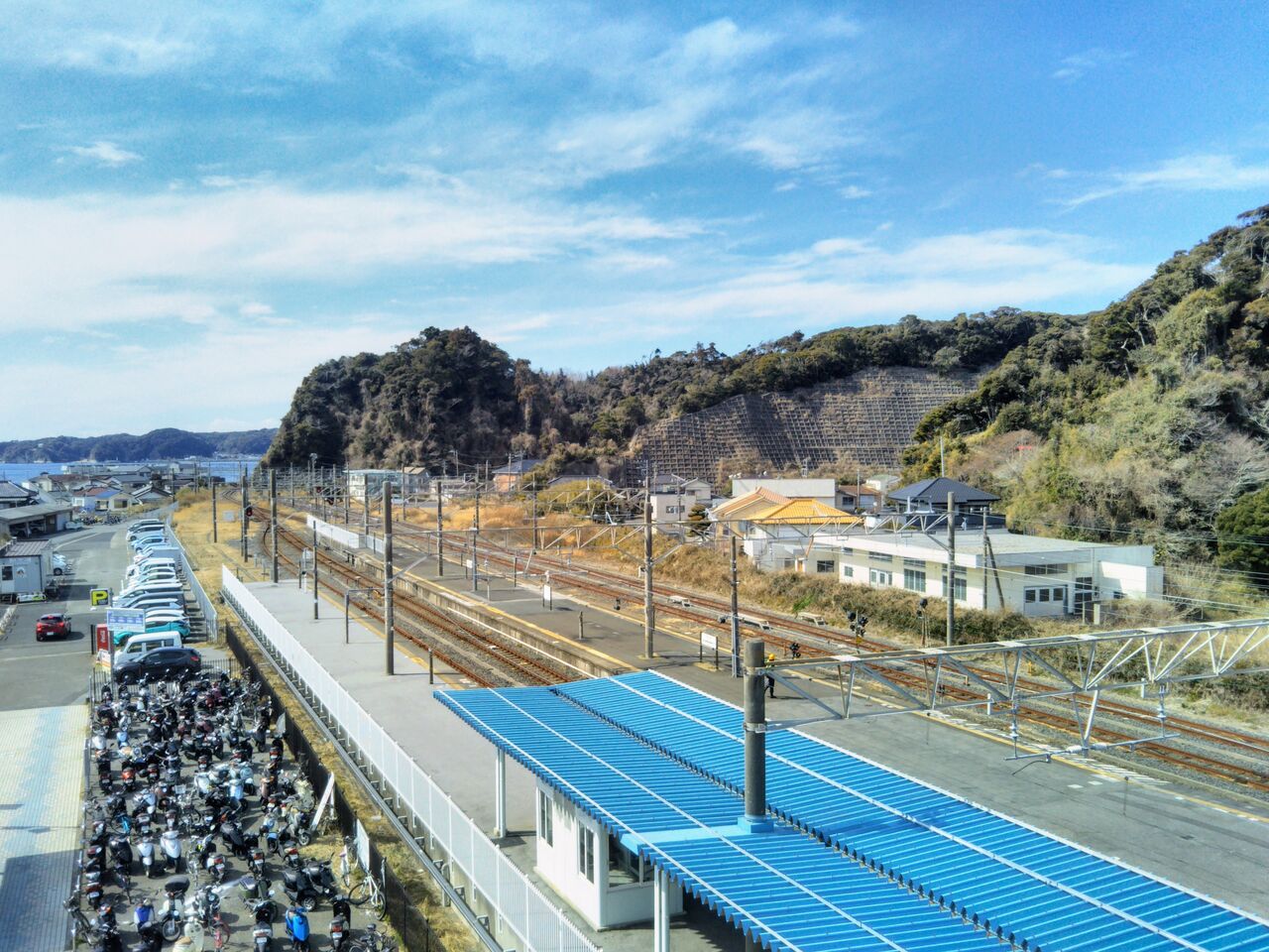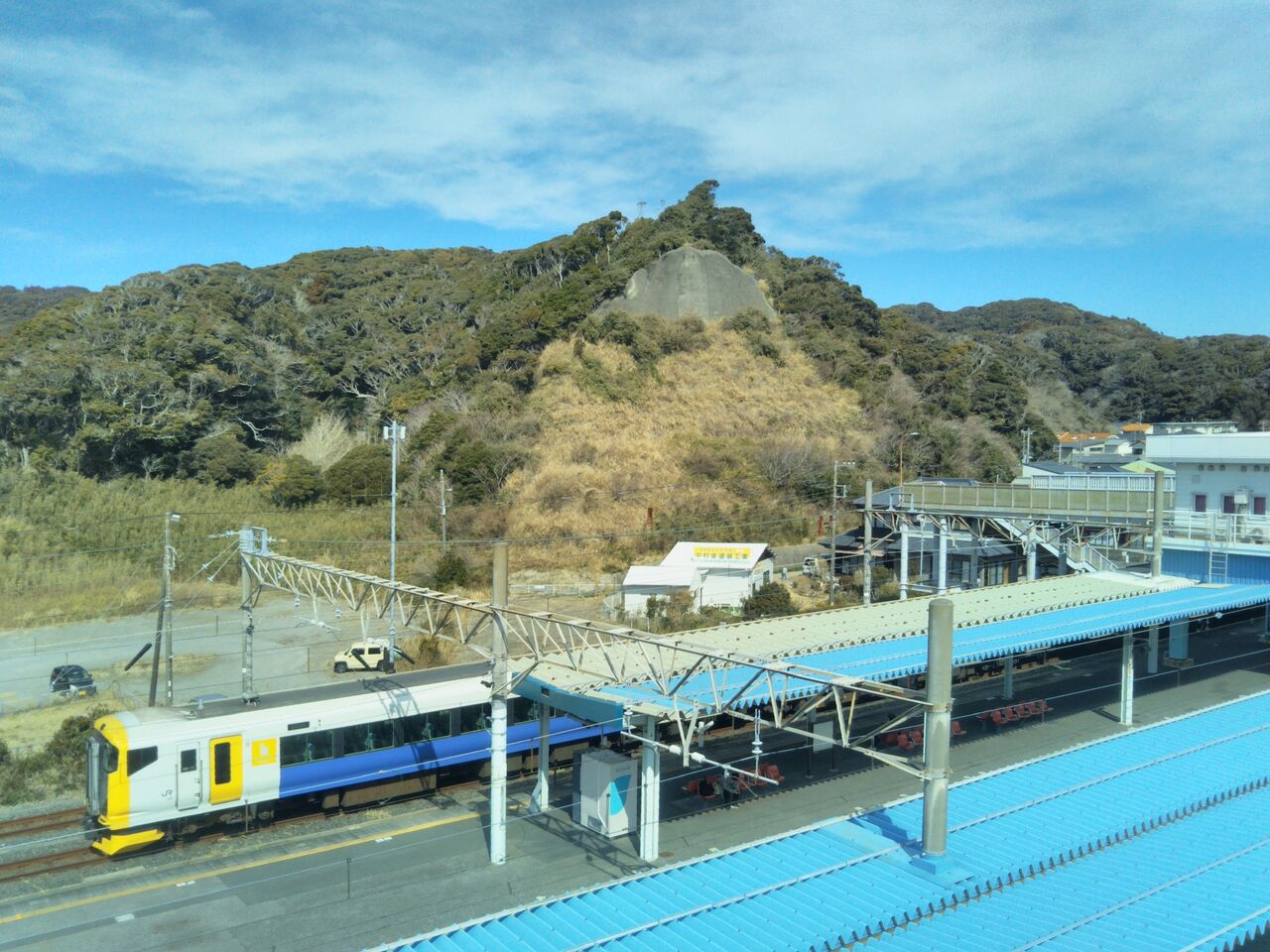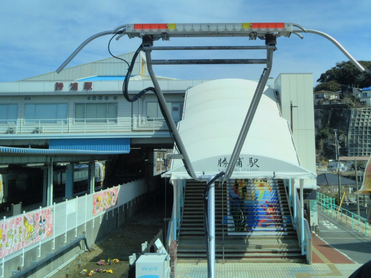 以下は乗車後に撮影。上昇途中の状態から見た勝浦駅舎。
