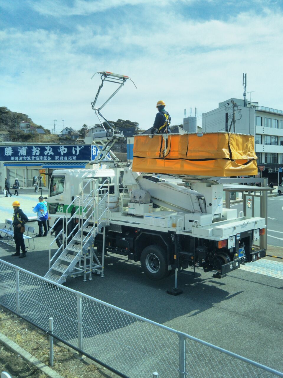 JR東日本千葉支社ではかつうらビッグひな祭り開催期間中の2025年(令和7年)2月24日、外房線勝浦駅にて高所作業車(軌陸車)『サスケ君』の乗車体験を有料(大人(中学生以上)1,000円、小学生500円、未就学児無料)にて実施しました。水平方向の移動は無く、作業床に乗り、上昇・下降といった高所作業車としての動きを体験する内容でした。なお、当該軌陸車が実際に作業用として運用されている範囲は外房線土気〜勝浦間です。