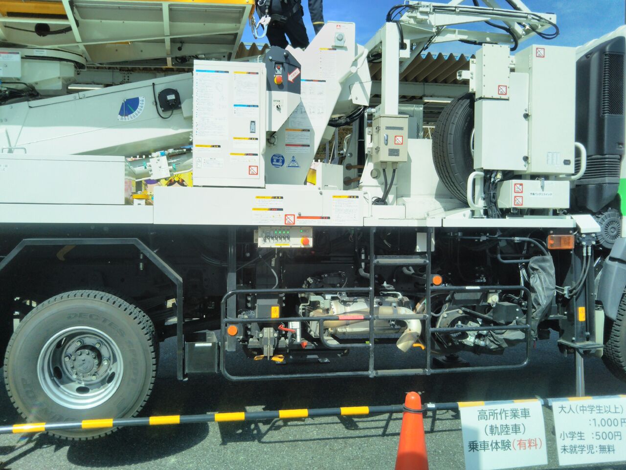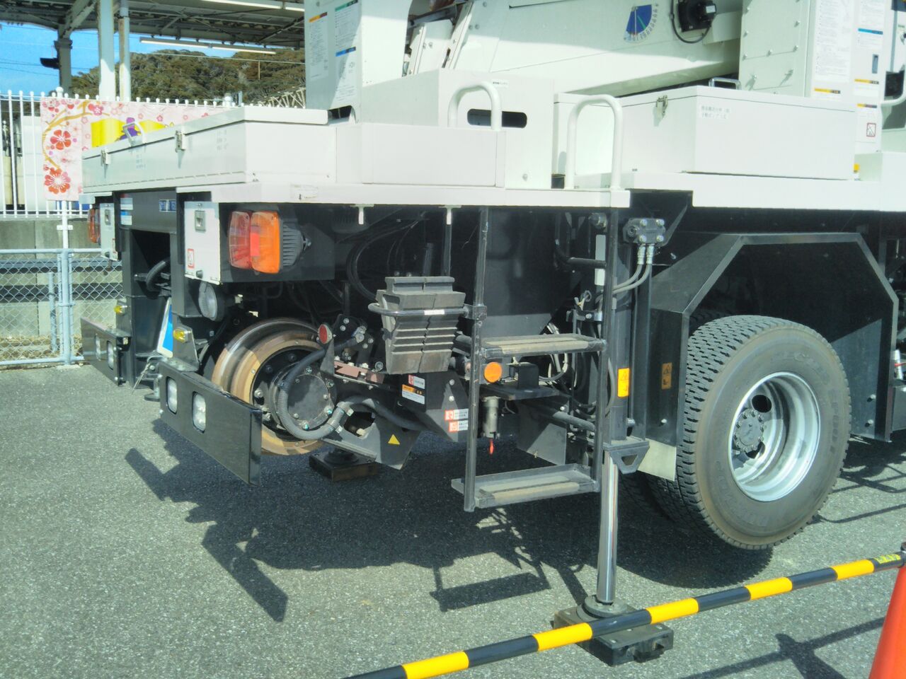 軌陸車なので線路を走行するための鉄輪も備えられています。今回は高所作業車としての乗車体験でしたので、ジャッキアップされた状態で車両が設置されており、下部が見やすくなっていました。