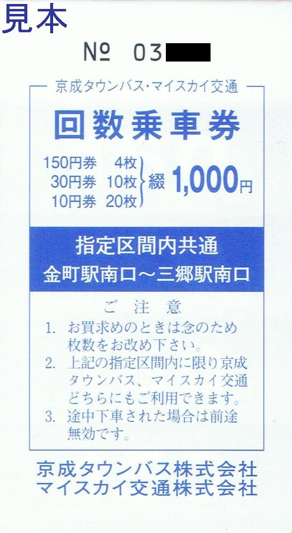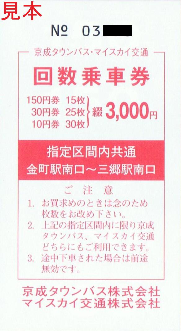 表紙には共同運行しているマイスカイ交通の社名も印刷されていますが、両社では発売している券種・セット構成が異なっており、京成タウンバス発行分では1,000円券、3,000円券の2種類のみ。内訳も10円券・30円券・150円券の3種類のみで構成(1,000円券、3,000円券で各券の枚数が異なるだけで、中身は同じ券)となっています。