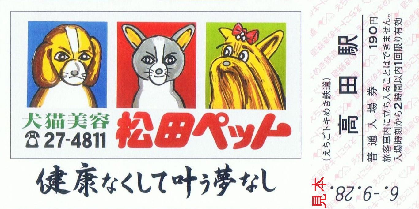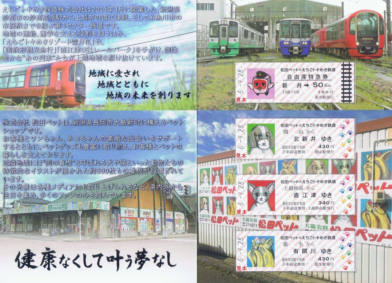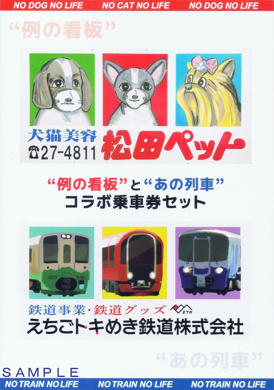 えちごトキめき鉄道では、長岡市の株式会社松田ペットとのコラボレーション企画として記念乗車券セット、記念入場券を発売しました。また、これに合わせて2024年(令和6年)10月5日〜11月30日、『トキ鉄で巡ろう!"例の看板"と"あの列車"を探そうキャンペーン』を開催し、オリジナル車内中吊り広告の掲出(妙高はねうまライン・ET127系電車及び国鉄形観光急行)、国鉄形観光急行の行先サボプレートをコラボ仕様に変更等のイベントを実施しました。