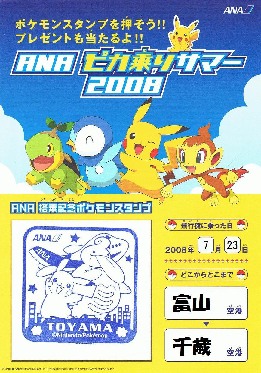 JR東日本との共同キャンペーン『ピカ乗りサマー2008』にあわせて作られた記念スタンプの富山空港版。設置されている空港の搭乗口側にだけ置いているようで、1回の搭乗につき1種類のスタンプだけが押せるようです。